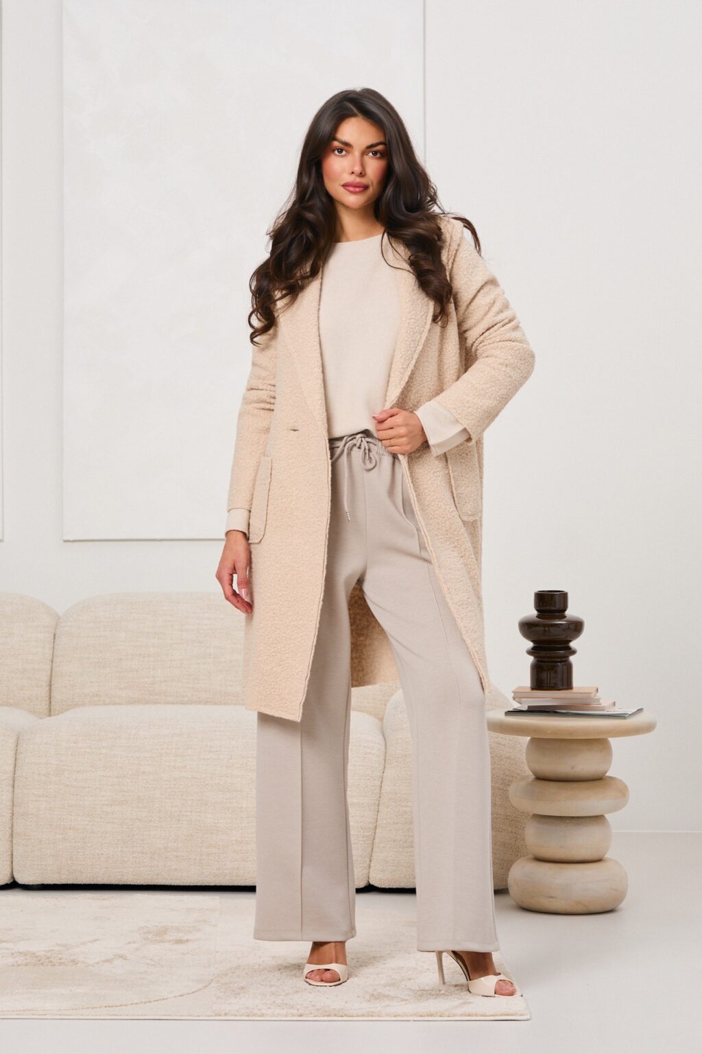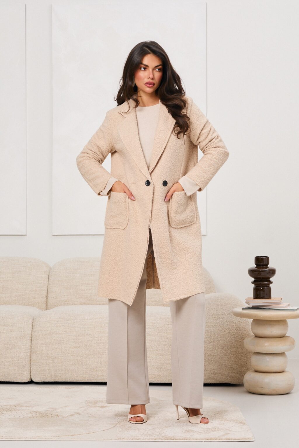 Płaszcz wykonany z miękkiej, strukturalnej tkaniny typu boucle, która zapewnia komfort noszenia i przyjemne ciepło w chłodniejsze dni; klasyczny, prosty krój o długości do kolan został uzupełniony kołnierzem z klapami, dwurzędowym zapięciem na kontrastowe guziki oraz praktycznymi, naszywanymi kieszeniami, a minimalistyczna forma i neutralna kolorystyka sprawiają, że płaszcz świetnie wpisuje się w styl casualowy i elegancki.