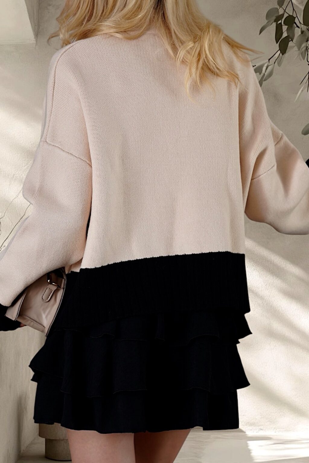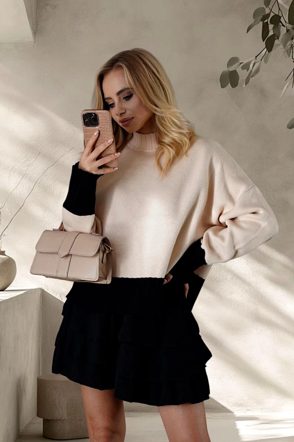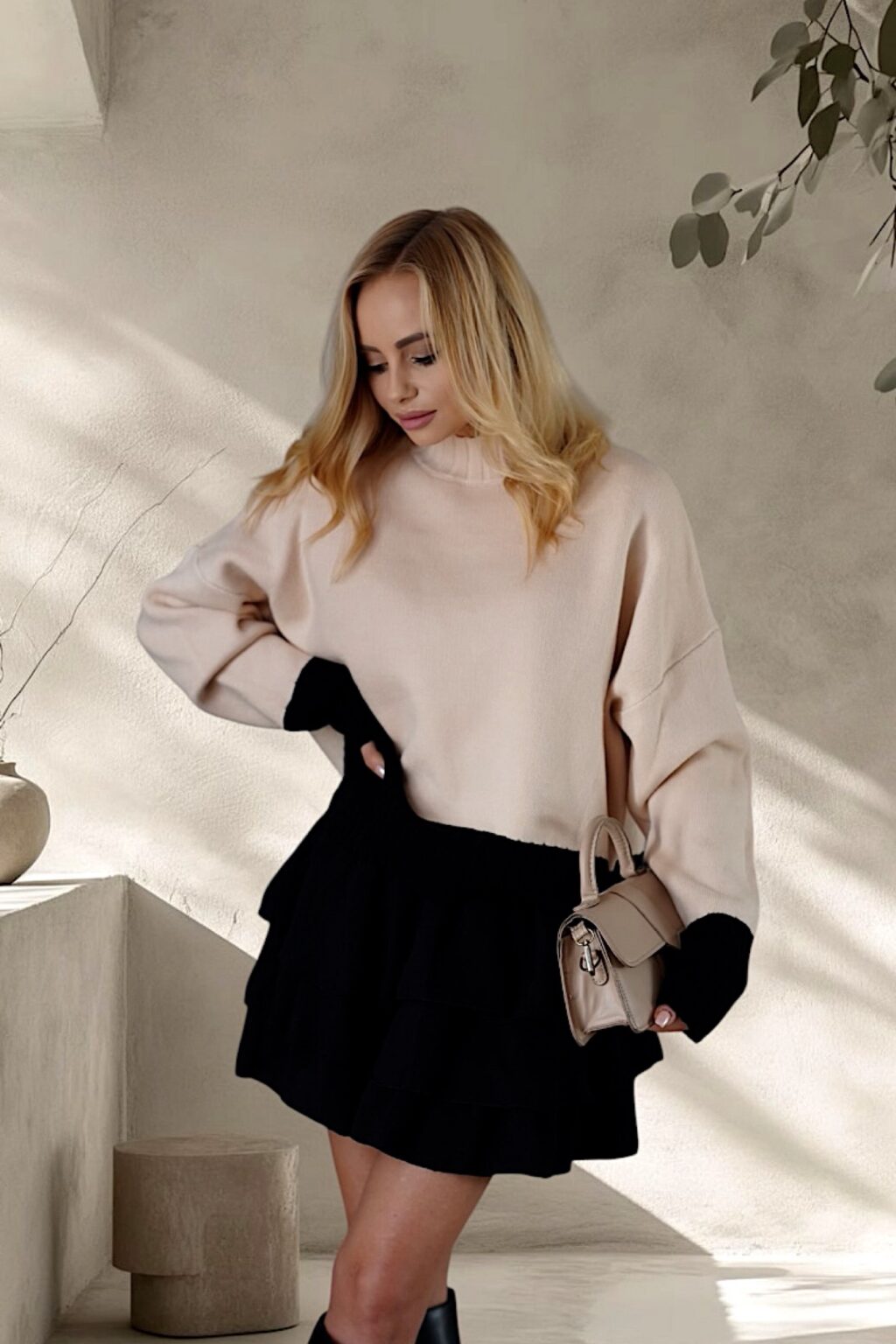 Solenne – to sweter, który łączy wygodę z nowoczesnym stylem. Wykonany z mieszanki wiskozy i nylonu, jest miękki, ciepły i przyjemny w dotyku. Luźniejszy krój oversize pozwala czuć się swobodnie, a kontrastowe czarne wykończenia nadają mu charakteru. To doskonały wybór na chłodniejsze dni – pasuje do jeansów, spódnic czy skórzanych legginsów. Idealny do pracy, na uczelnię czy weekendowe wyjazdy. Do wyboru w dwóch kolorach: beżowym z czarnym dołem oraz czarnym – z beżowym akcentem.