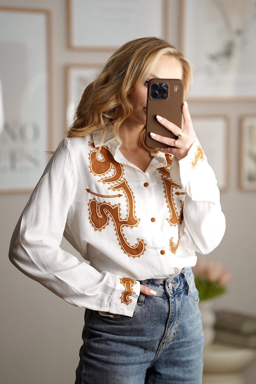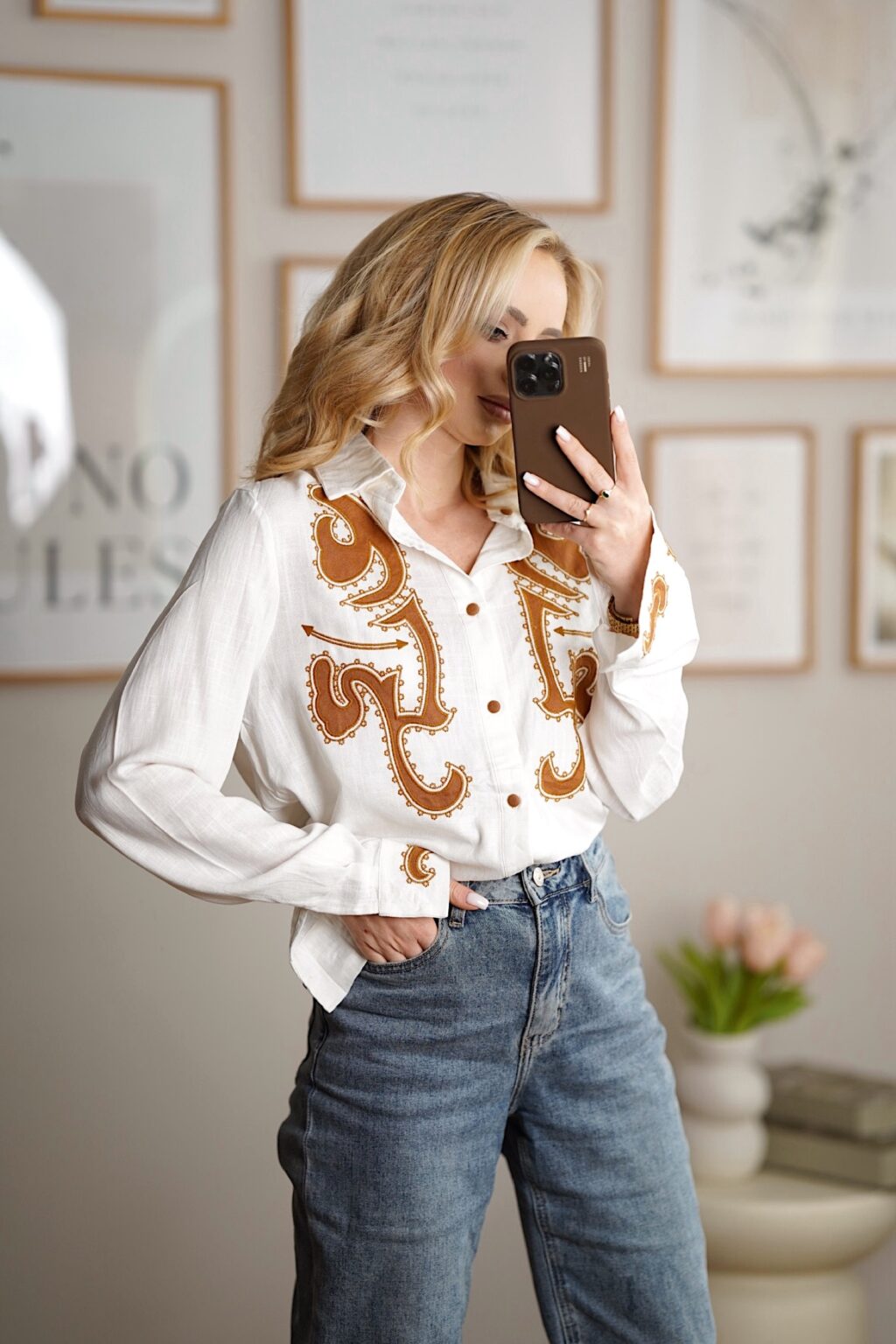 Biała koszula boho wykonana z naturalnej mieszanki wiskozy i lnu to must-have w kobiecej garderobie. Lekka, przewiewna tkanina zapewnia komfort noszenia nawet w cieplejsze dni, a swobodny fason w stylu boho dodaje nonszalanckiej elegancji. Model idealnie sprawdzi się w codziennych stylizacjach, na wakacyjne wyjazdy oraz jako baza do bardziej dopracowanych zestawów. Klasyczna biel czyni koszulę niezwykle uniwersalną.