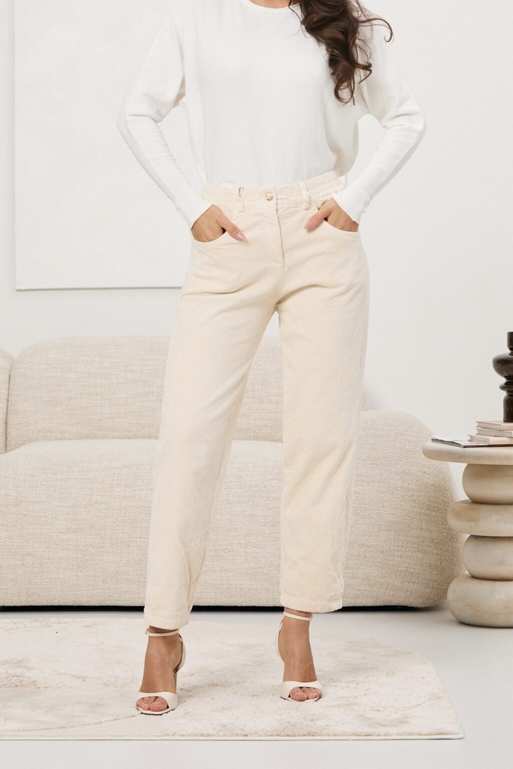 Spodnie NOEMI o prostym, lekko skróconym kroju, wykonane z miękkiego, drobno prążkowanego sztruksu, który jest przyjemny w dotyku i dobrze układa się na sylwetce; model z wysokim stanem podkreślającym talię, zapinany na ozdobny guzik, z praktycznymi kieszeniami z przodu, nogawki o luźniejszym fasonie zapewniają komfort noszenia i swobodę ruchów.