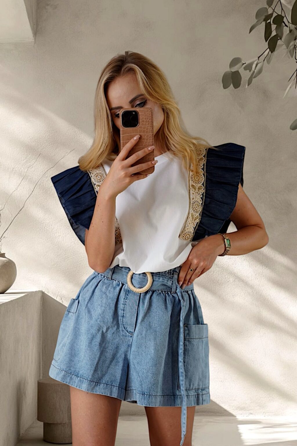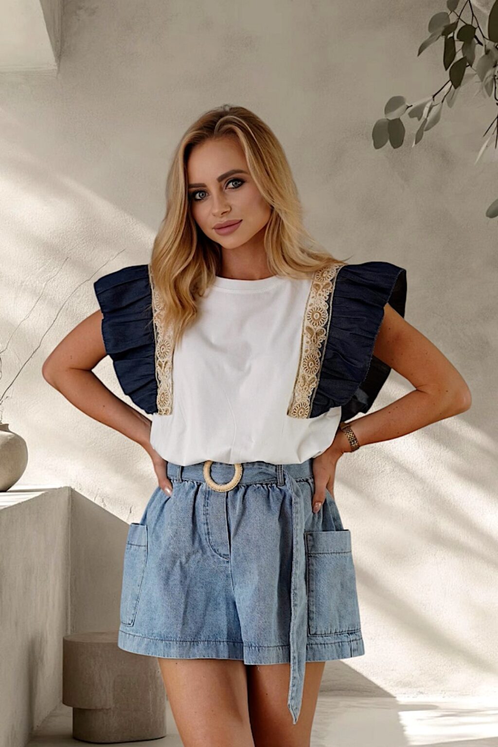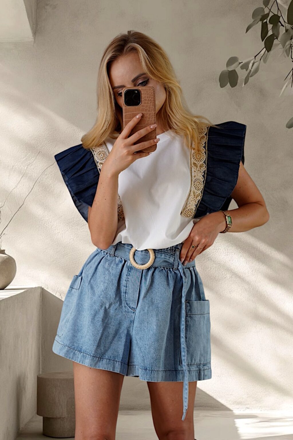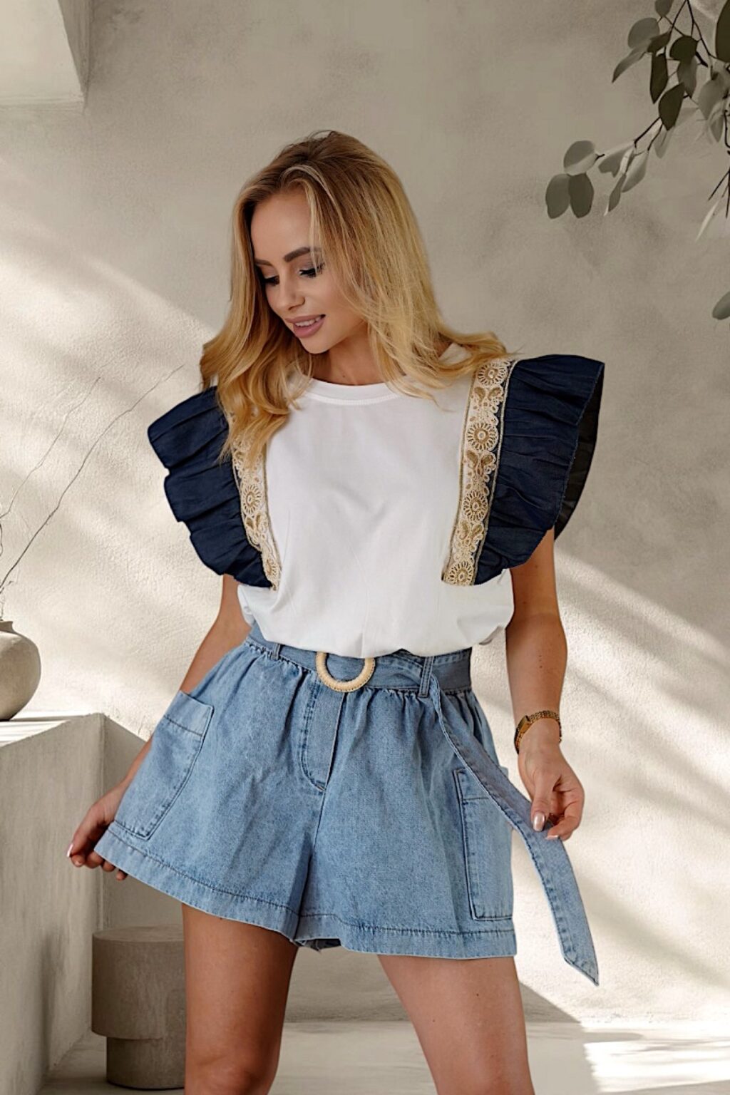 Boho Spirit to kwintesencja swobody i stylu boho. Bawełniana baza została urozmaicona ozdobnymi rękawkami z falbankami i koronką, dzięki czemu koszulka staje się efektownym elementem stylizacji. Pasuje zarówno do jeansowych szortów, jak i do spódnicy maxi czy spodni palazzo. To koszulka, która w prosty sposób nadaje charakteru całemu outfitowi.
