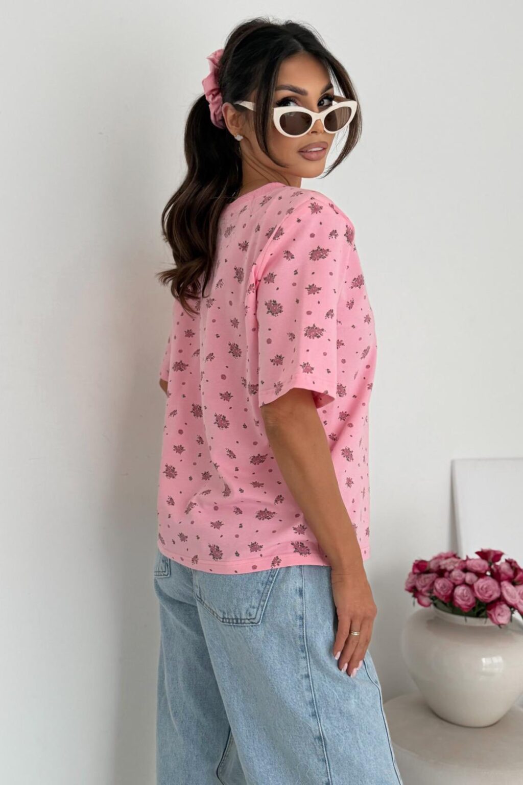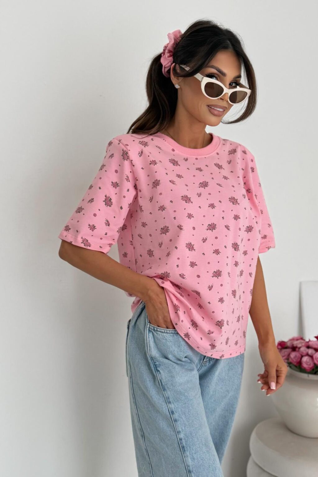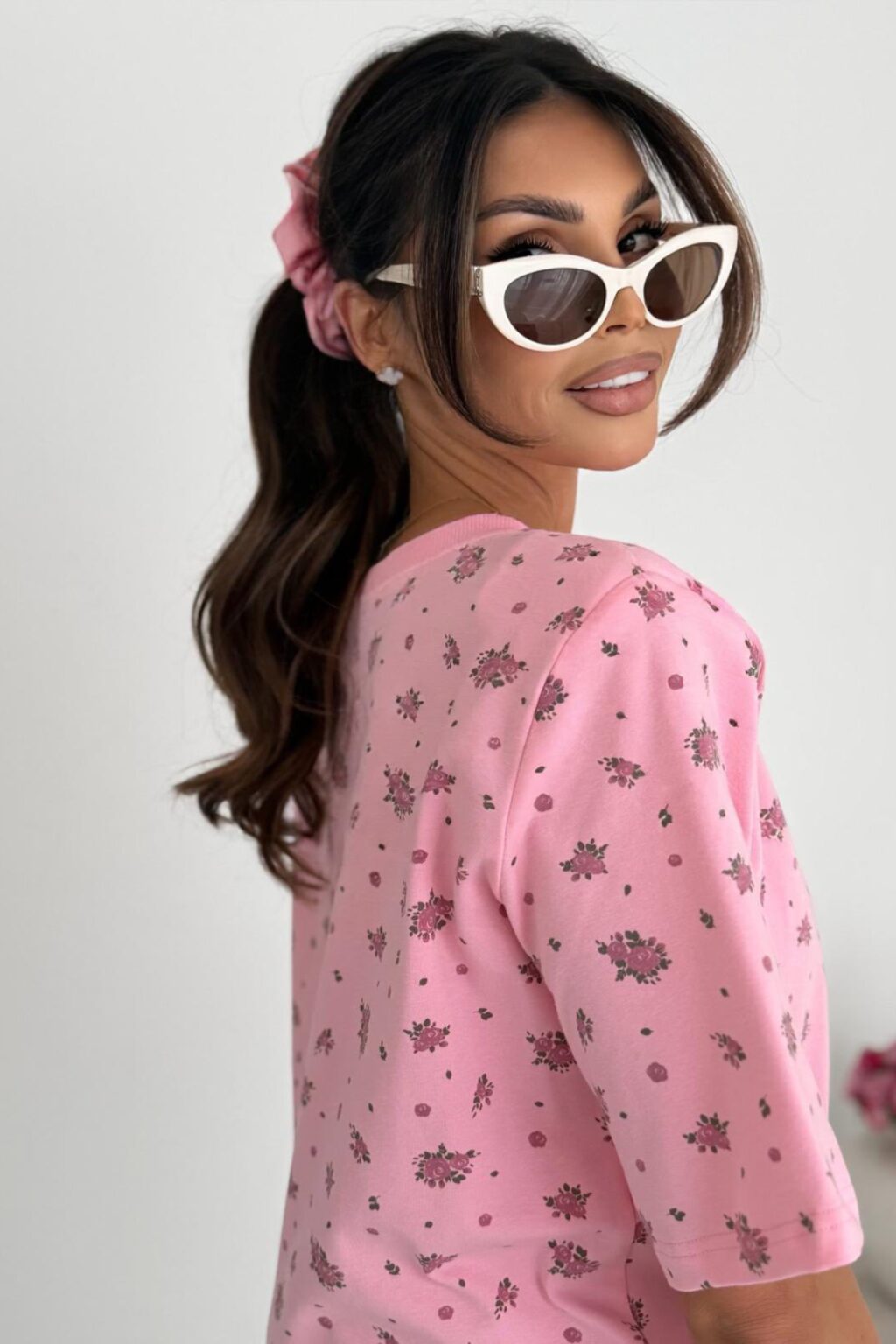 Bawełniany T-shirt LUIZA w kwiaty z gumką | róż 🩷