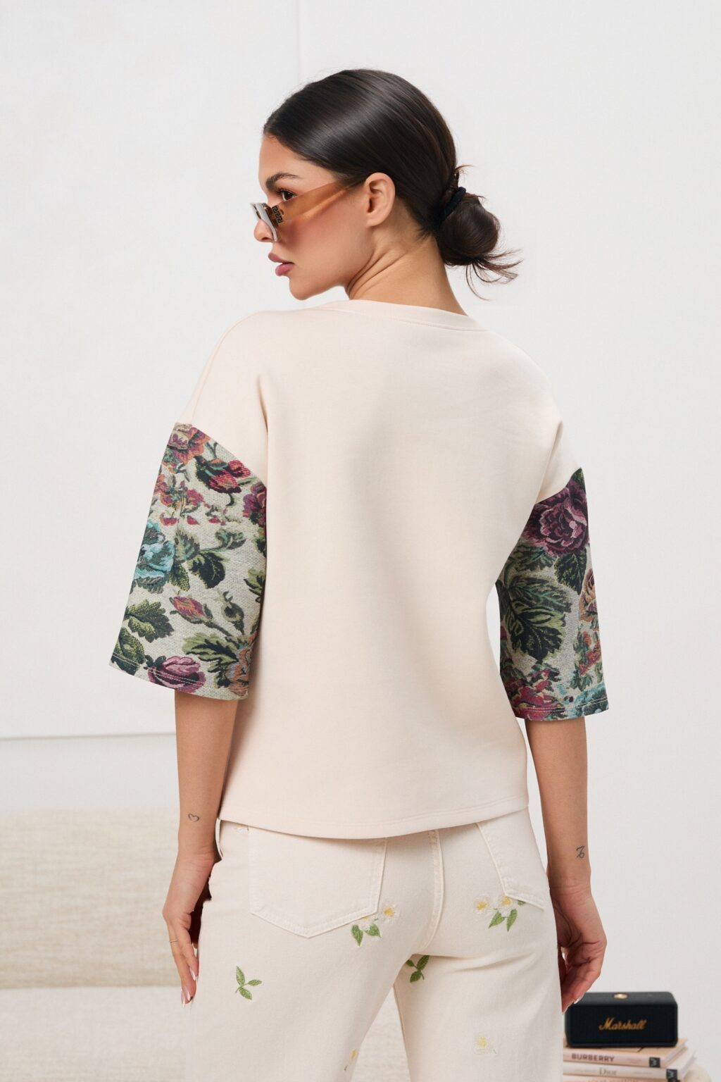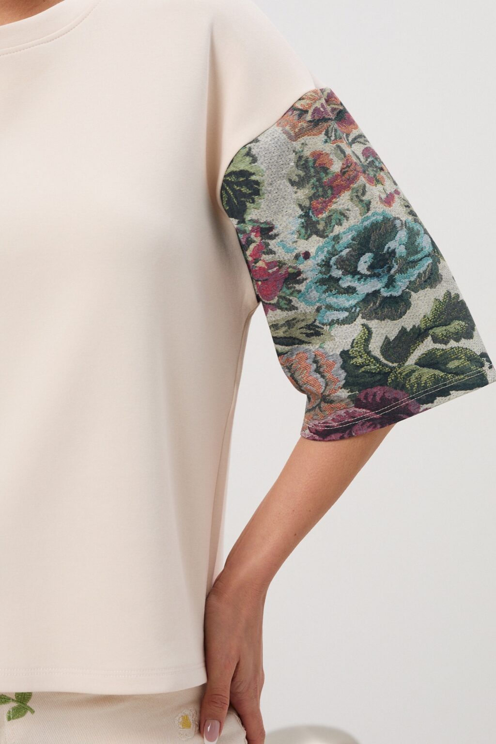Bluzka o prostym, lekko luźnym kroju została wykonana z gładkiej, przyjemnej w dotyku tkaniny. Model posiada klasyczny, okrągły dekolt oraz rękawy o długości 3/4, które wyróżniają się dekoracyjnym, kwiatowym wzorem w stylu gobelinowym, nadającym całości wyrazistego charakteru. Minimalistyczny fason korpusu doskonale kontrastuje z bogato zdobionymi rękawami, tworząc harmonijne i stylowe połączenie idealne zarówno do codziennych, jak i bardziej eleganckich stylizacji.