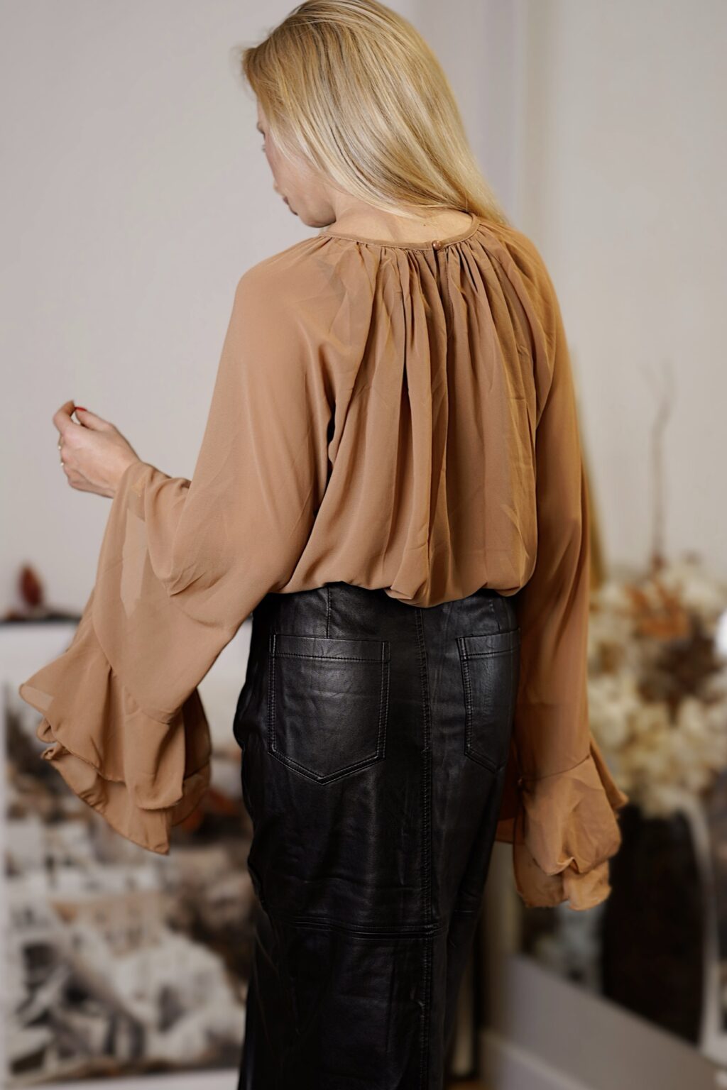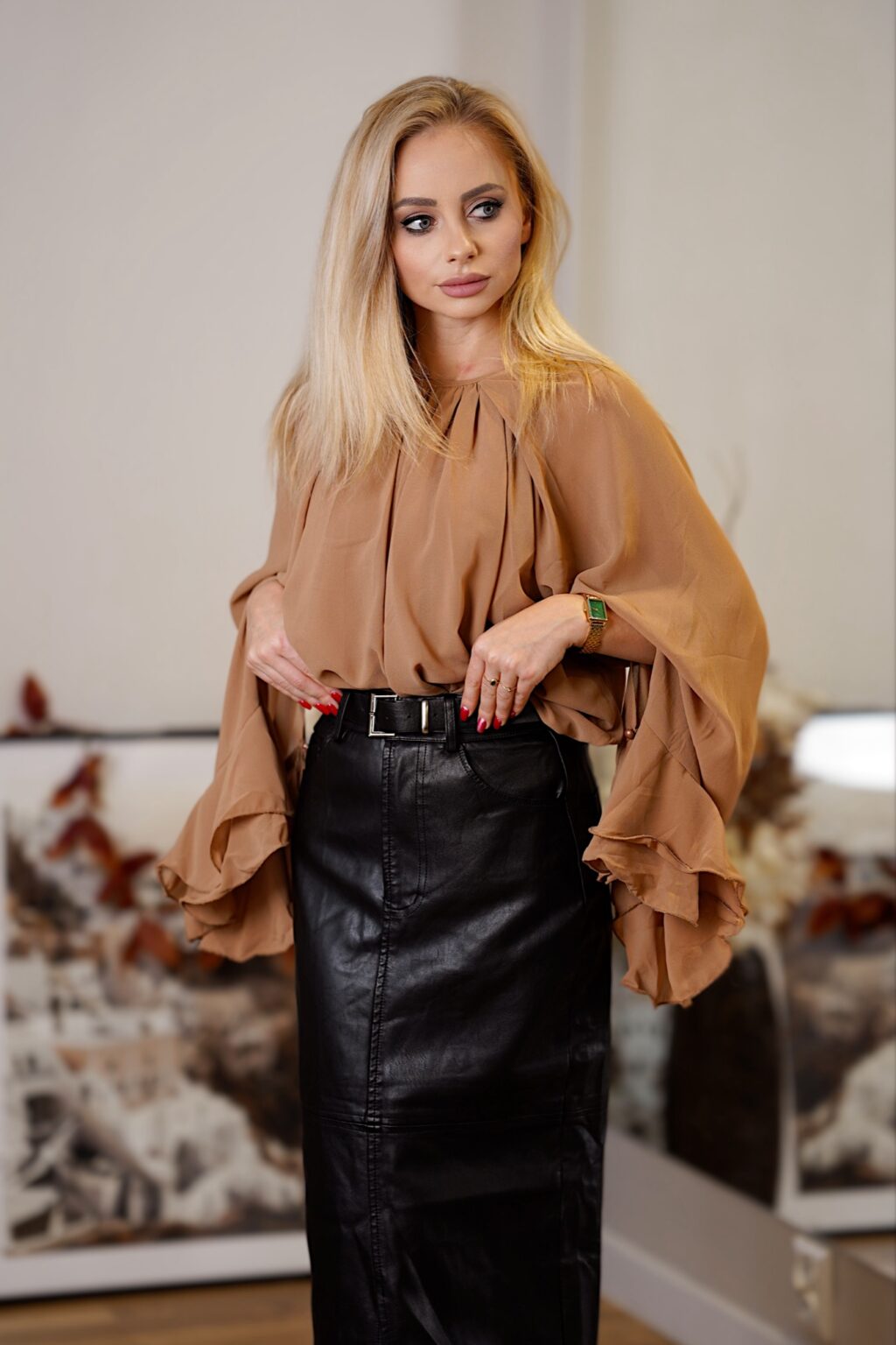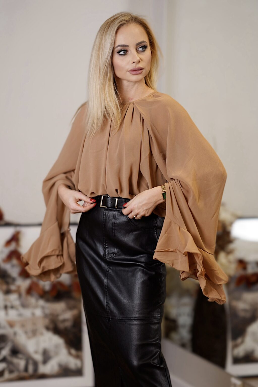Romance Nude to bluzka, która łączy minimalizm z efektem WOW. Obszerne, falujące rękawy i delikatna tkanina nadają jej wyjątkowego charakteru. Pasuje zarówno do spódnic z eko skóry, jak i eleganckich spodni. Elegancka, ponadczasowa – klasyczna.
