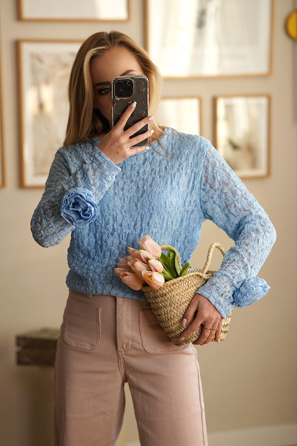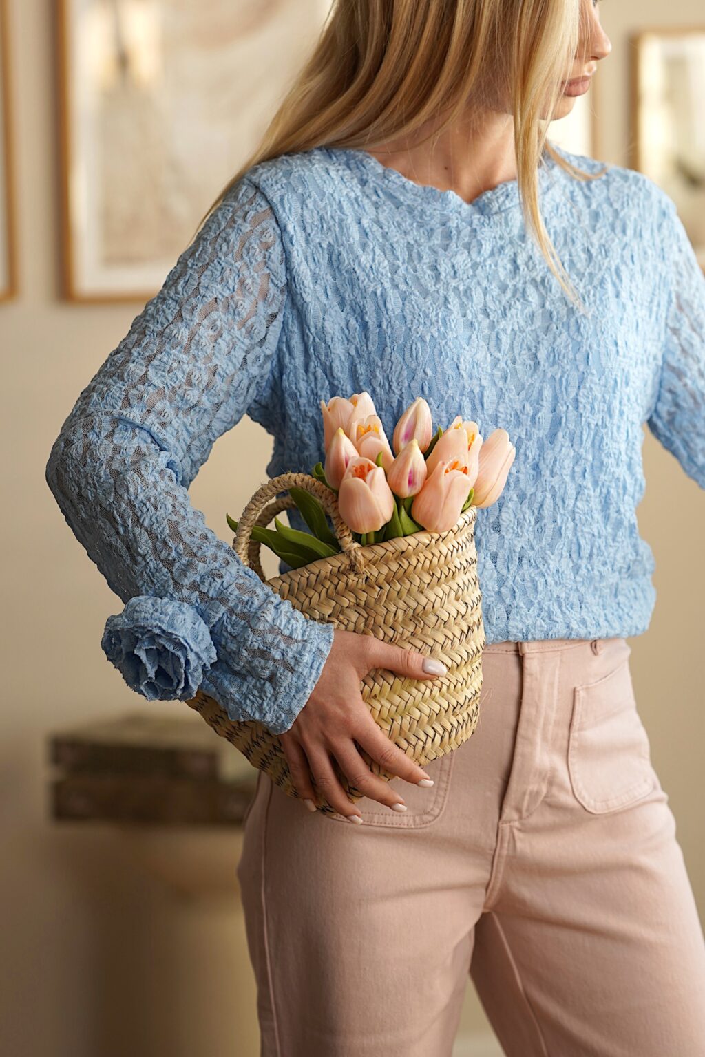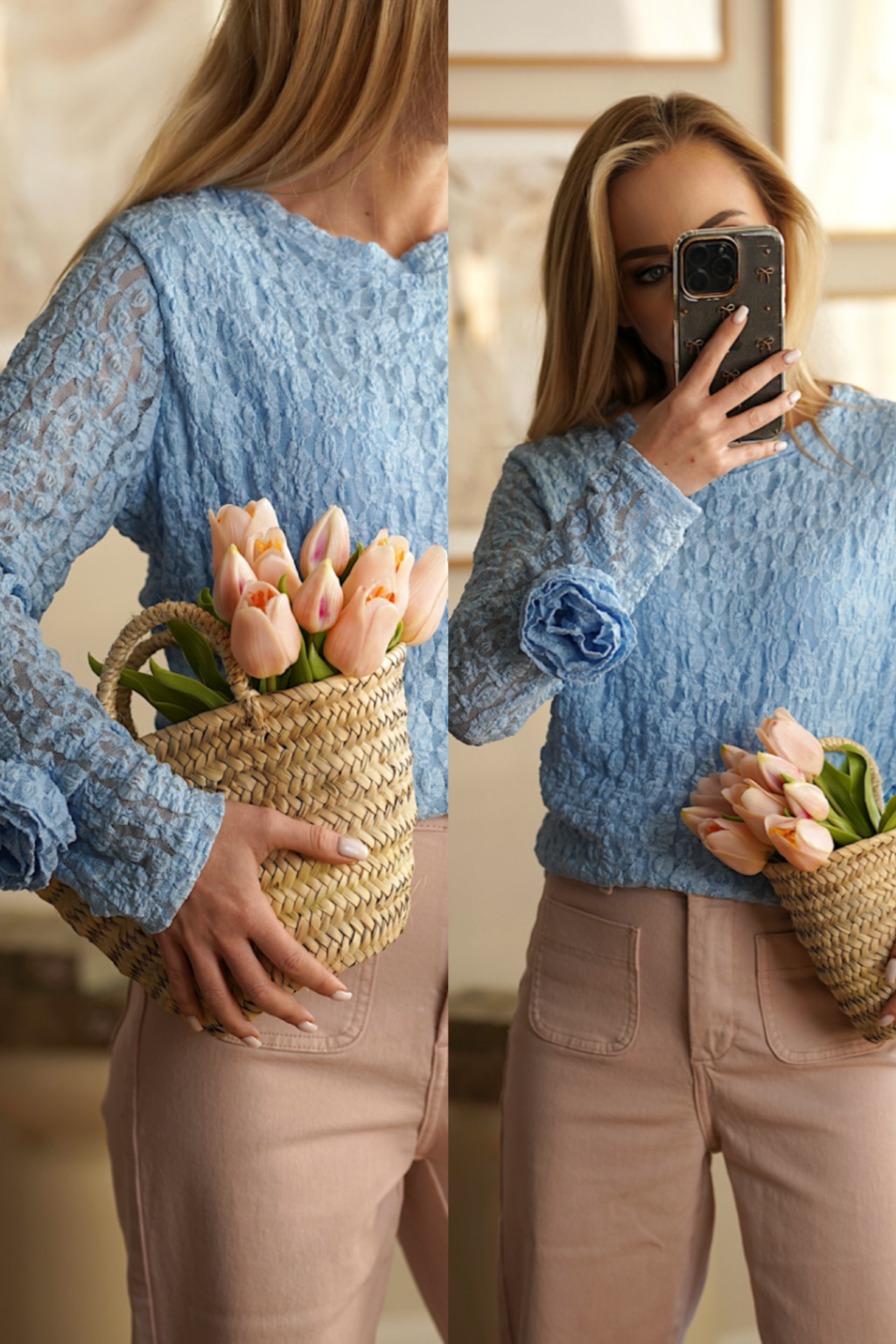 Lekka bluzka w pastelowych kolorach z ozdobnymi kwiatami na rękawach. Wykonana z elastycznego materiału, pięknie dopasowuje się do sylwetki, a boczny ściągacz subtelnie podkreśla talię. Idealna propozycja do codziennych i romantycznych stylizacji.
