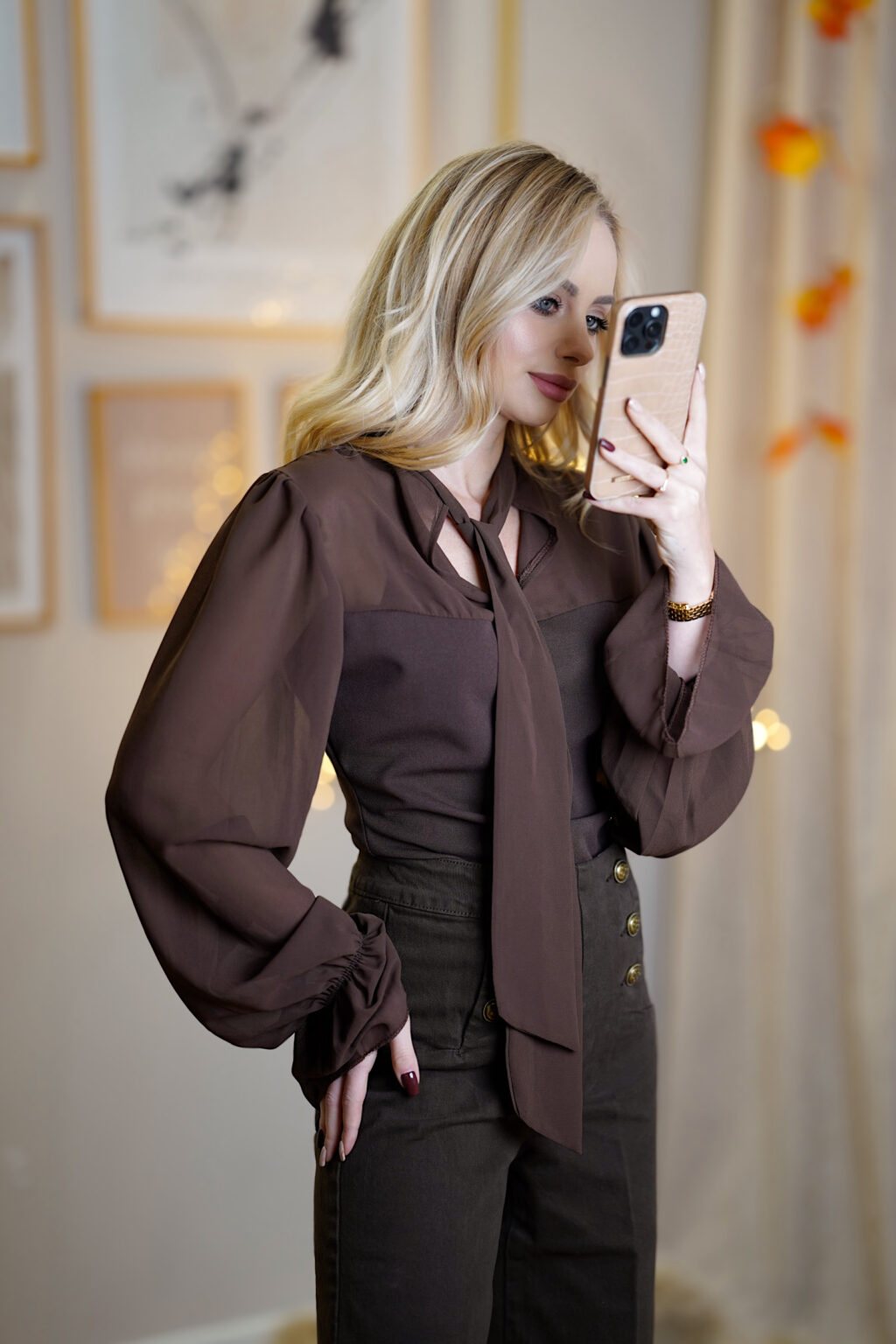 Bluzka z wiązaniem SOFT TIE | brązowa