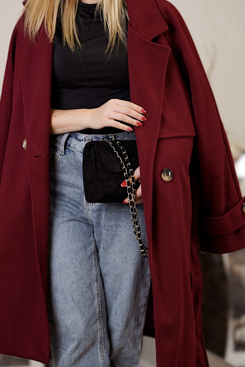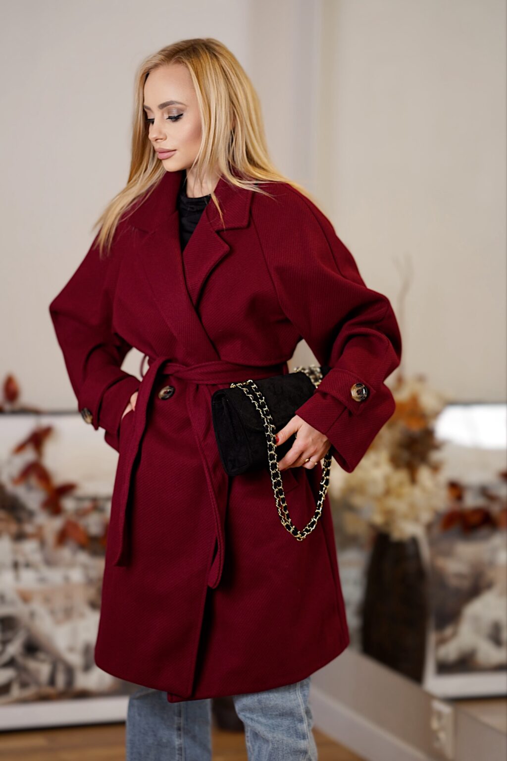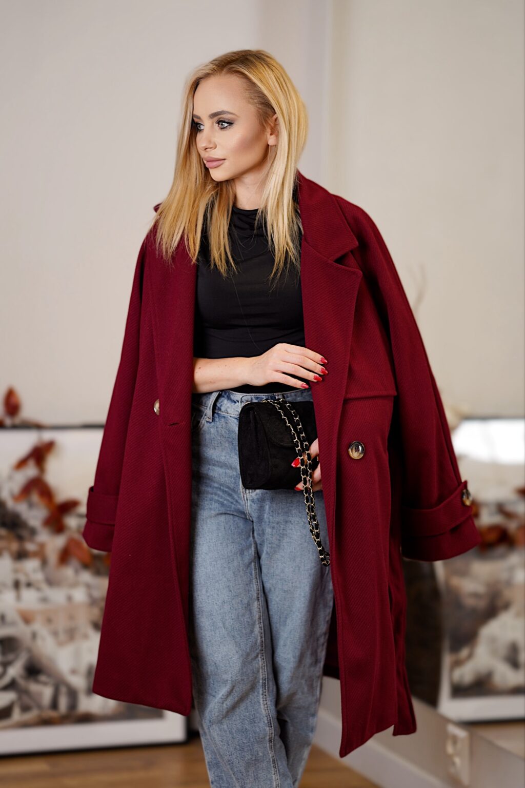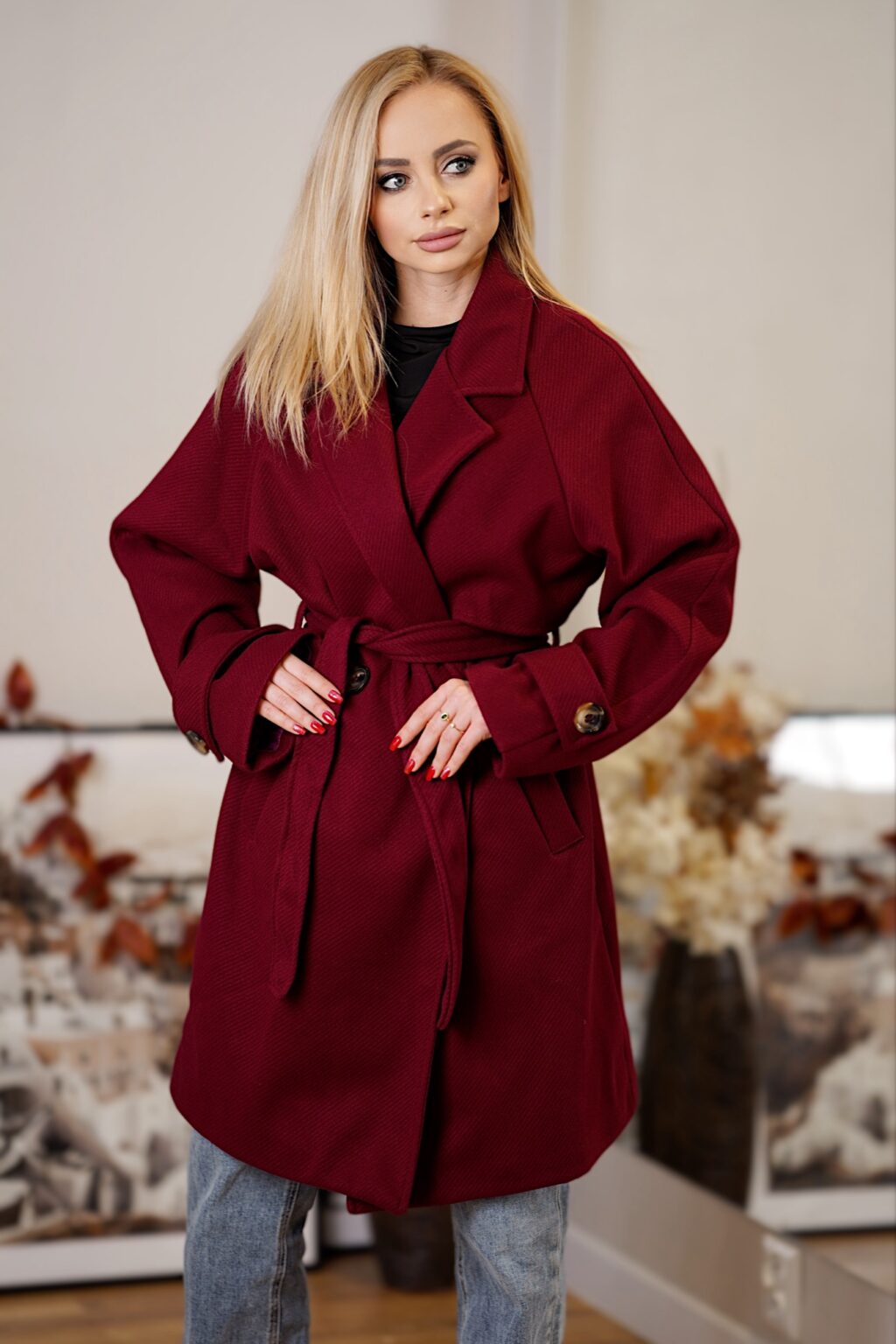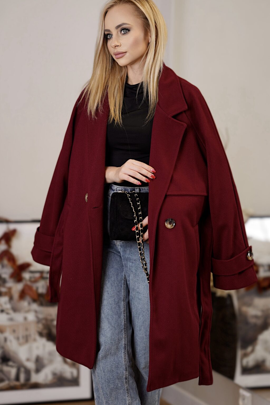 Elegancki płaszcz z paskiem CITY BREAK | bordowy