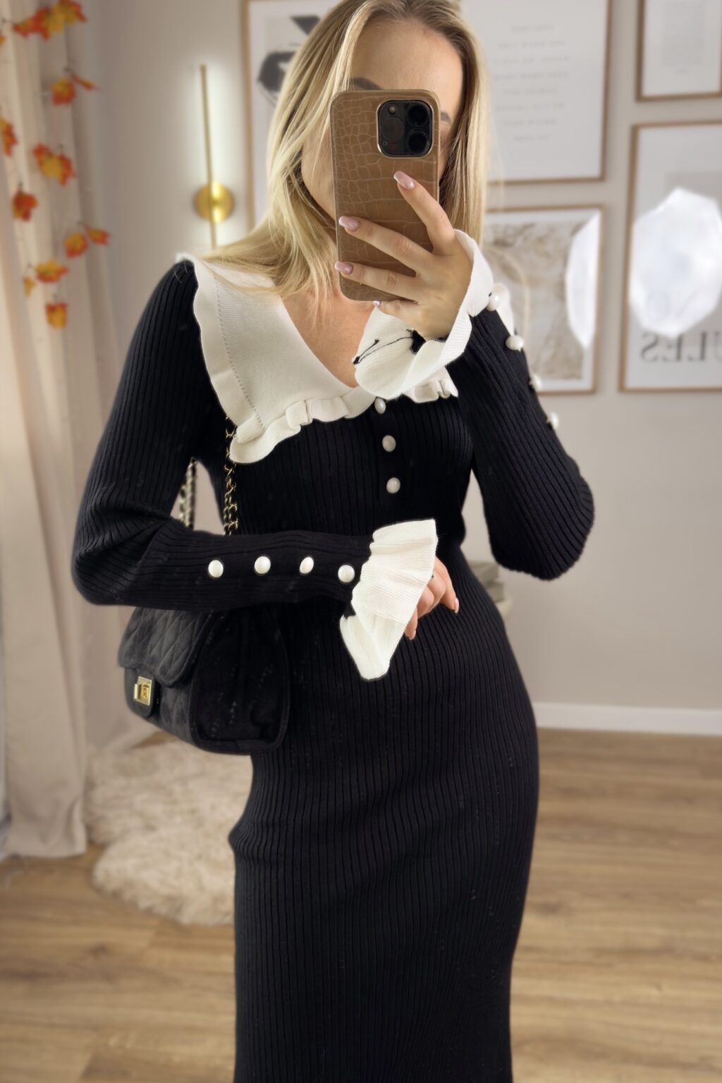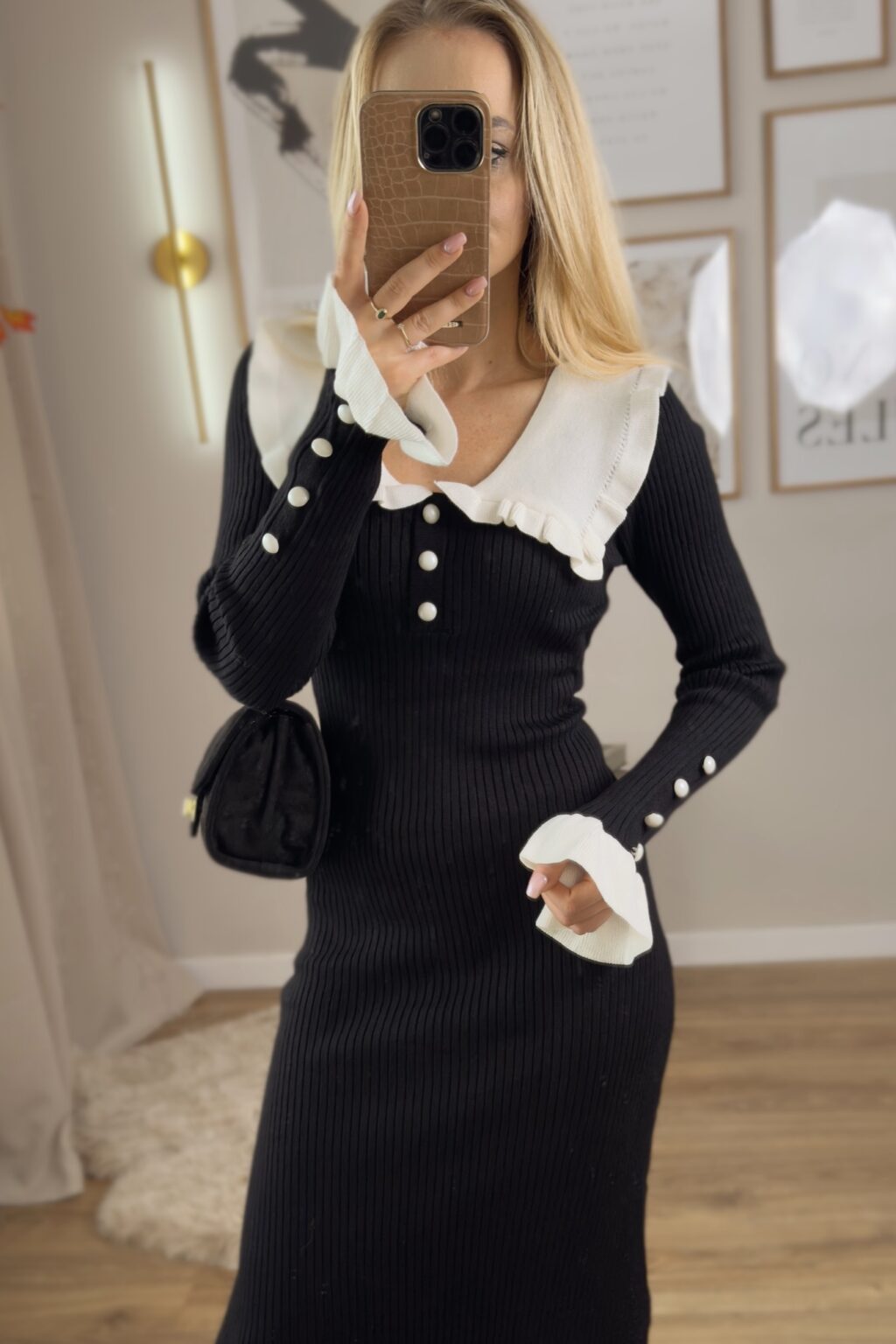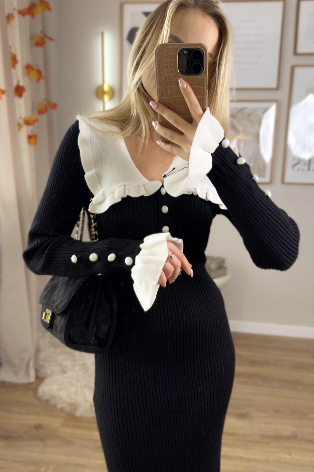 Dzianinowa, dopasowana do sylwetki, z uroczym kołnierzykiem i ozdobnymi guzikami. Falbanki przy mankietach i dole sukienki nadają jej wyjątkowego, romantycznego charakteru. Idealna zarówno na co dzień z balerinami, jak i na wieczorne wyjście z eleganckimi szpilkami. Dostępna w dwóch kolorach – klasycznej czerni oraz subtelnym beżu.