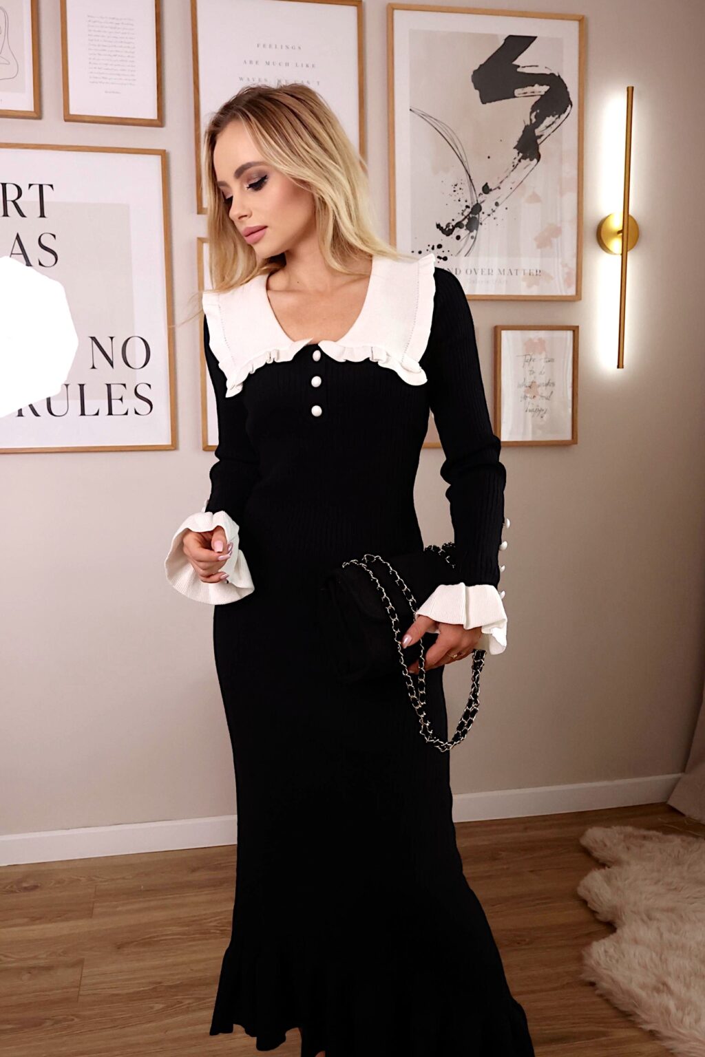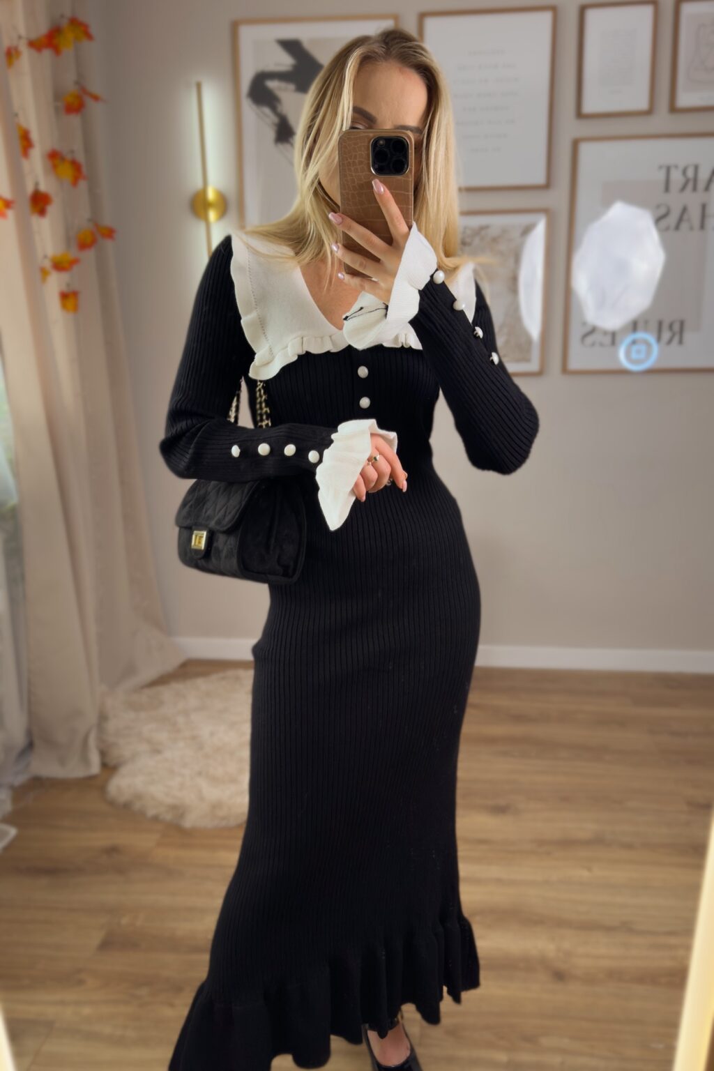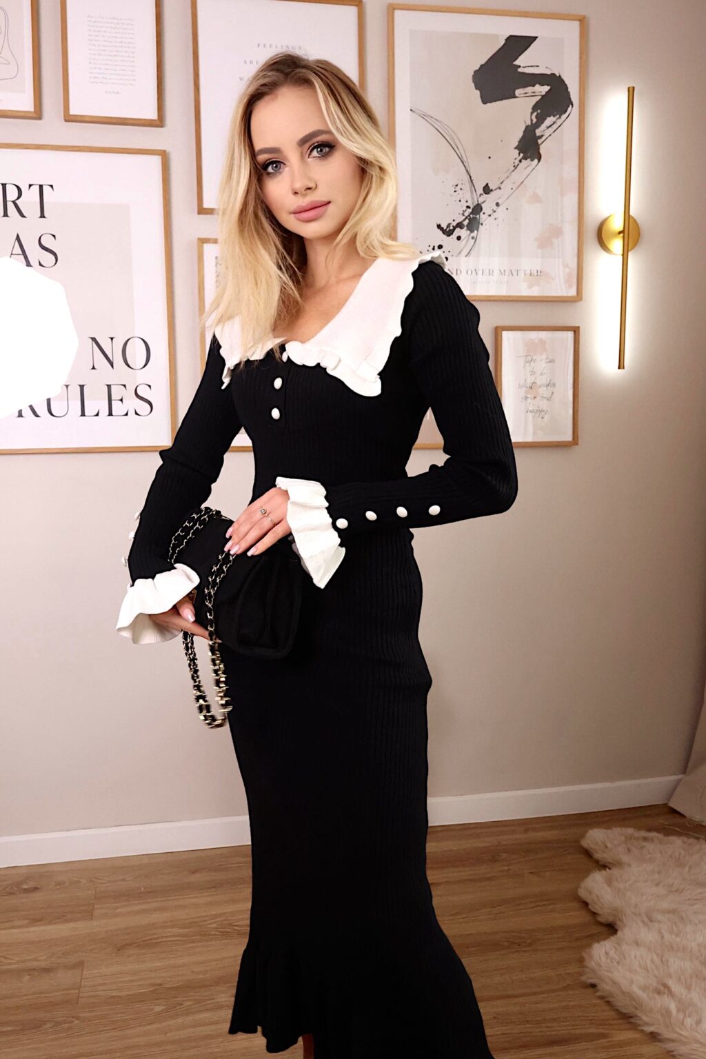 Dzianinowa, dopasowana do sylwetki, z uroczym kołnierzykiem i ozdobnymi guzikami. Falbanki przy mankietach i dole sukienki nadają jej wyjątkowego, romantycznego charakteru. Idealna zarówno na co dzień z balerinami, jak i na wieczorne wyjście z eleganckimi szpilkami. Dostępna w dwóch kolorach – klasycznej czerni oraz subtelnym beżu.