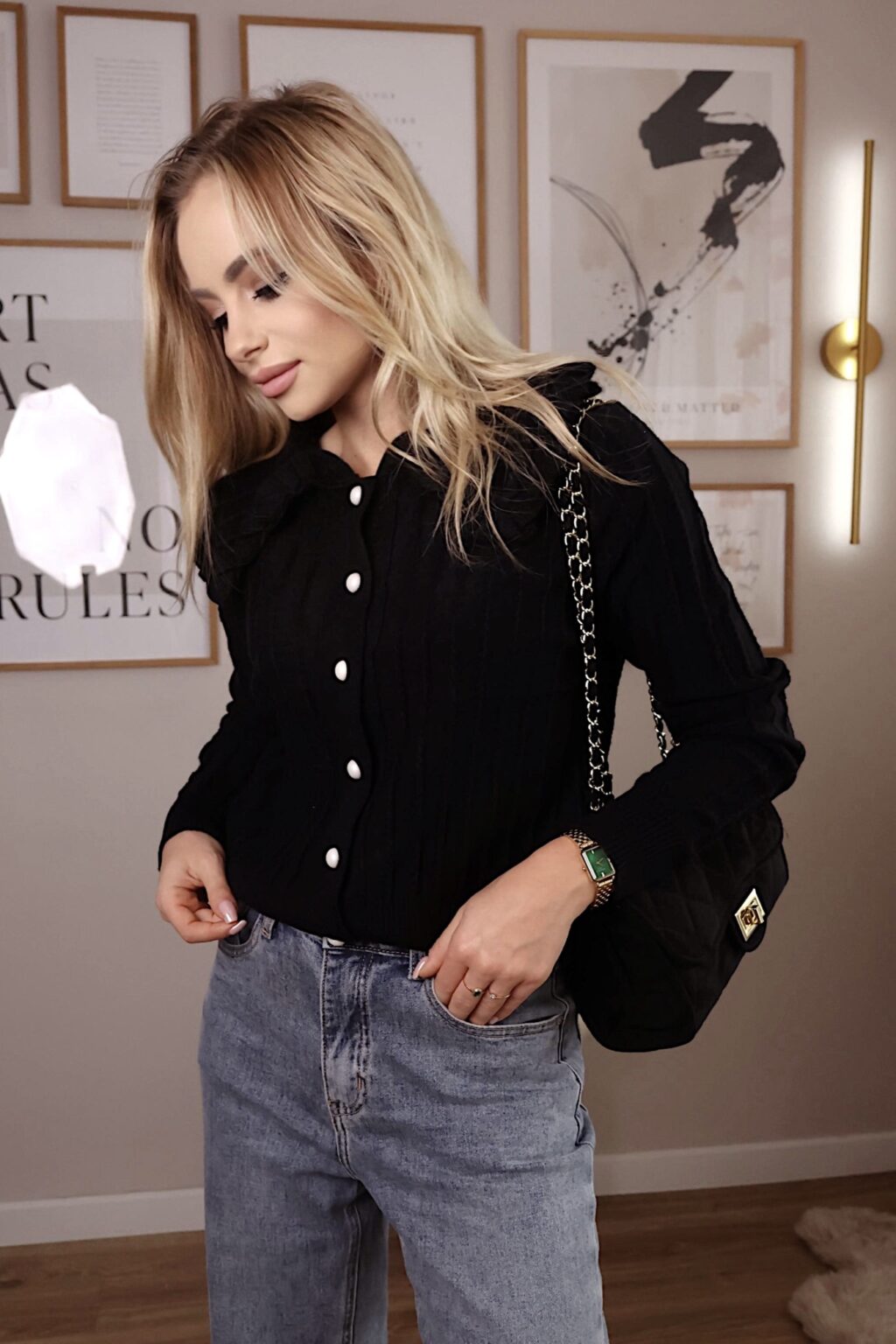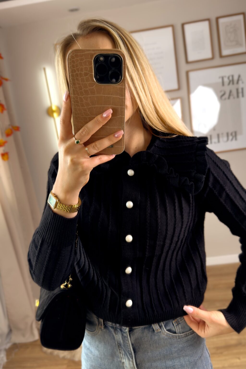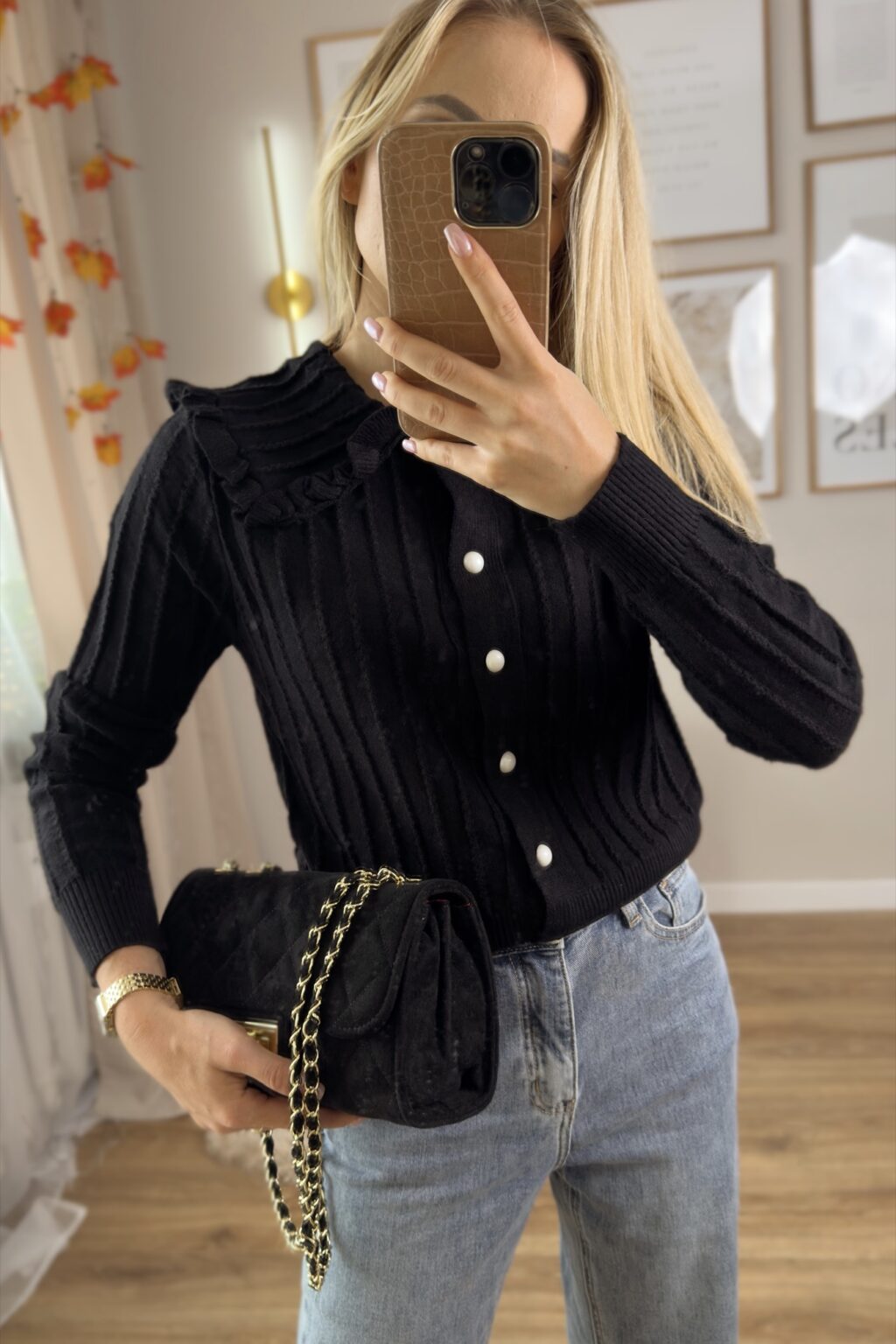 Dzianinowa, dopasowana do sylwetki, z uroczym kołnierzykiem i ozdobnymi guzikami. Falbanki przy mankietach i dole sukienki nadają jej wyjątkowego, romantycznego charakteru. Idealna zarówno na co dzień z balerinami, jak i na wieczorne wyjście z eleganckimi szpilkami. Dostępna w dwóch kolorach – klasycznej czerni oraz subtelnym beżu.
