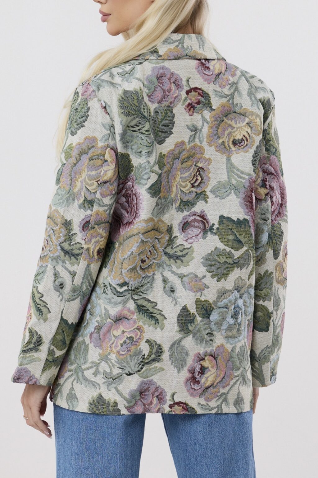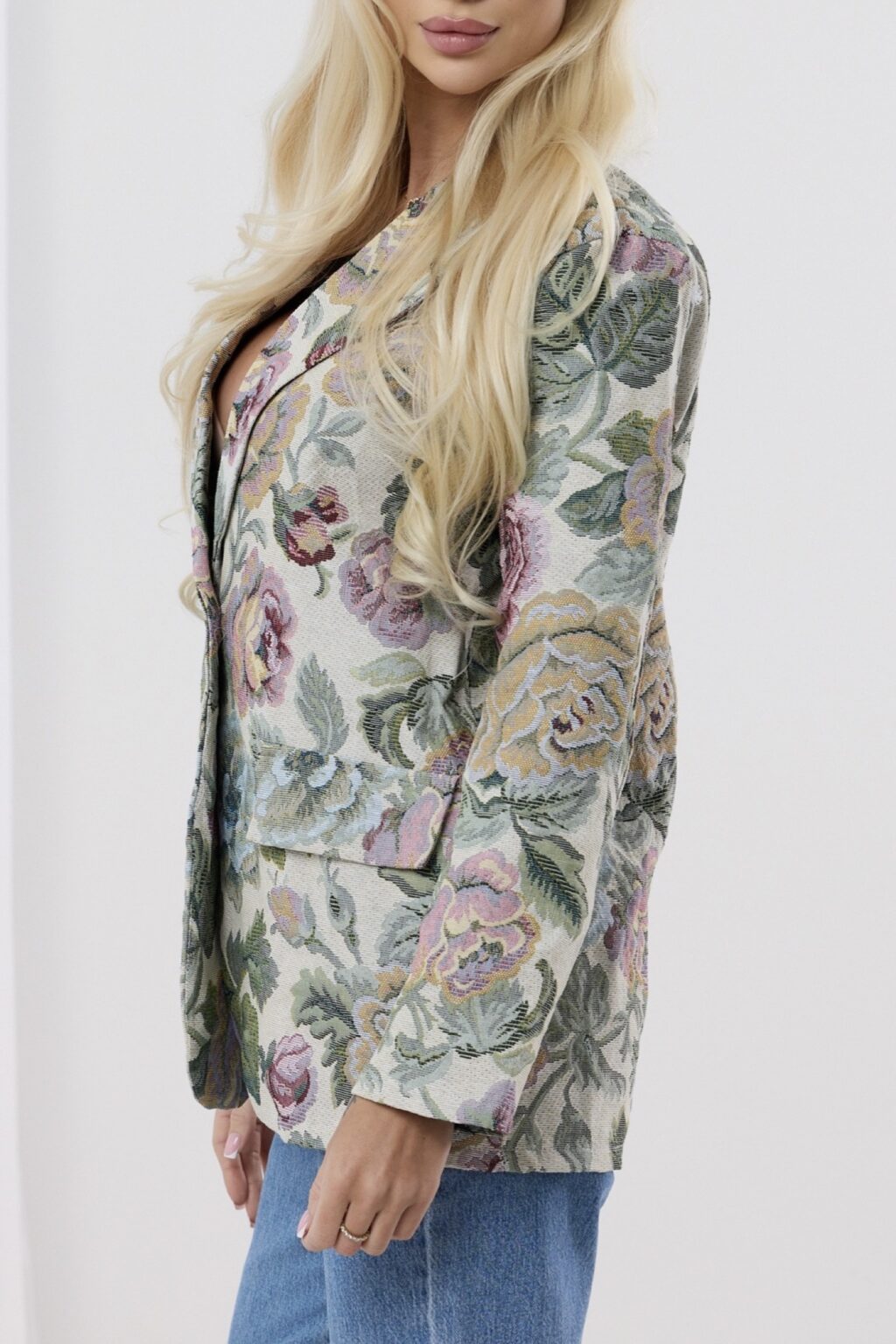 Marynarka FLORIA o klasycznym kroju wykonana z wysokiej jakości tkaniny żakardowej typu gobelin, która przyciąga wzrok bogatym, wielokolorowym wzorem florystycznym. Model charakteryzuje się luźniejszym fasonem z wyraźnie zaznaczonymi klapami, eleganckim zapięciem na jeden guzik oraz funkcjonalnymi kieszeniami z patkami po bokach. To idealne połączenie vintage’owego szyku z nowoczesną formą, które doskonale komponuje się zarówno z klasycznymi jeansami, jak i bardziej formalnymi elementami garderoby, stanowiąc wyrazisty punkt każdej stylizacji.