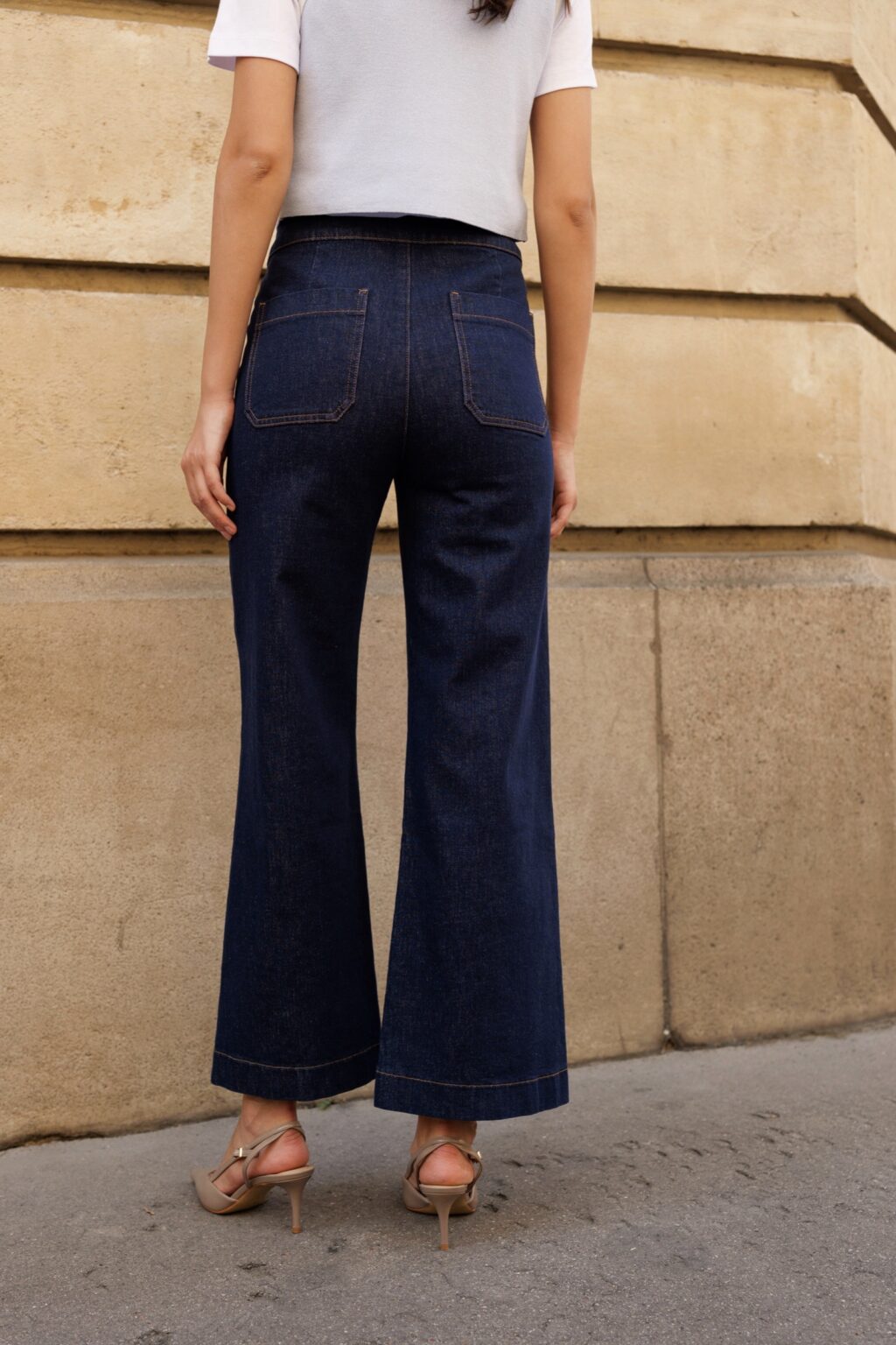Jeansy Marine w stylu wide leg to kwintesencja niezobowiązującej elegancji i komfortu. Te wyjątkowe spodnie łączą klasyczną estetykę z nowoczesnymi detalami, tworząc idealne uzupełnienie każdej garderoby. Charakterystycznym elementem są szerokie nogawki, które swobodnie opływają sylwetkę, zapewniając swobodę ruchów i nadając stylu retro. Zaprojektowane z myślą o kobiecych kształtach, posiadają strategicznie umieszczone kieszenie z tyłu, które dzięki specjalnemu szyciu działają jak efekt push-up, subtelnie modelując i podkreślając pośladki.