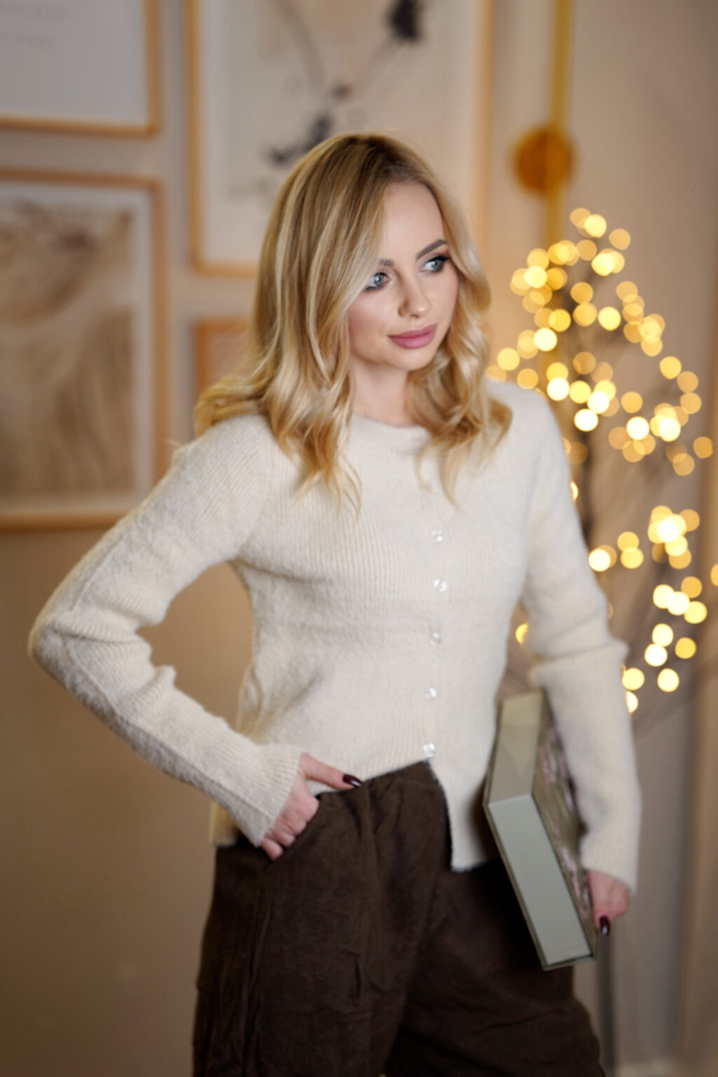 Kardigan Soft Aura otula miękkością i kobiecością. Jego delikatne włosie dodaje mu luksusowego charakteru, a lekki połysk materiału sprawia, że wygląda wyjątkowo szlachetnie. To model, który możesz założyć do wszystkiego — od jeansów po satynową sukienkę.