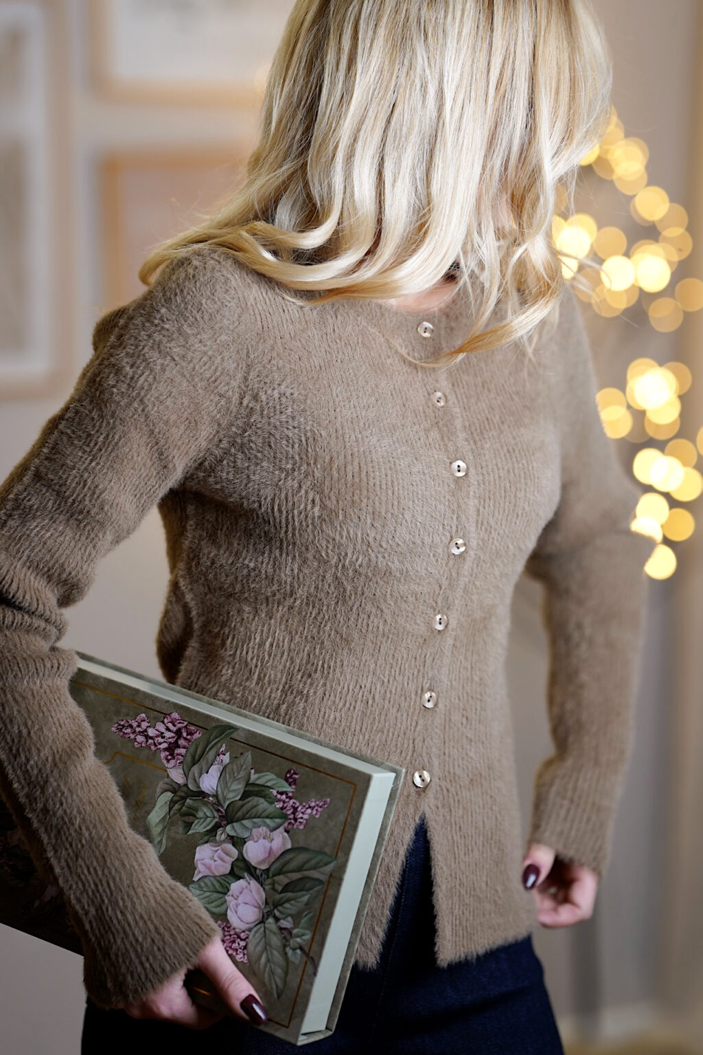 Kardigan Soft Aura otula miękkością i kobiecością. Jego delikatne włosie dodaje mu luksusowego charakteru, a lekki połysk materiału sprawia, że wygląda wyjątkowo szlachetnie. To model, który możesz założyć do wszystkiego — od jeansów po satynową sukienkę.