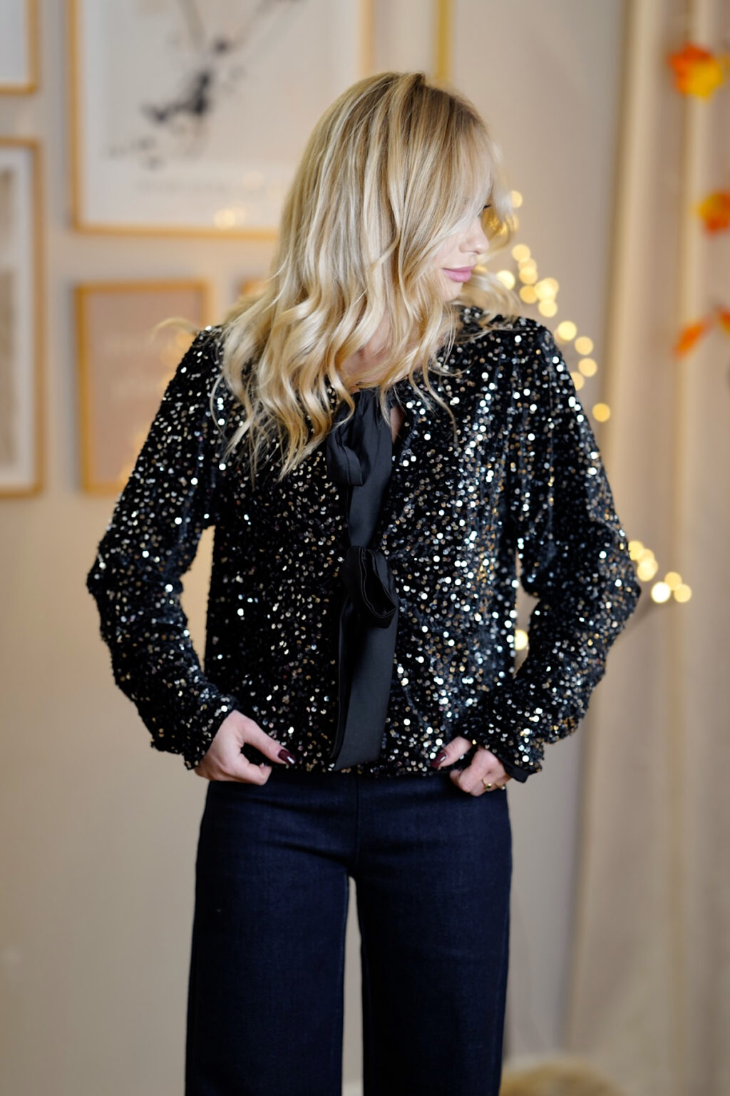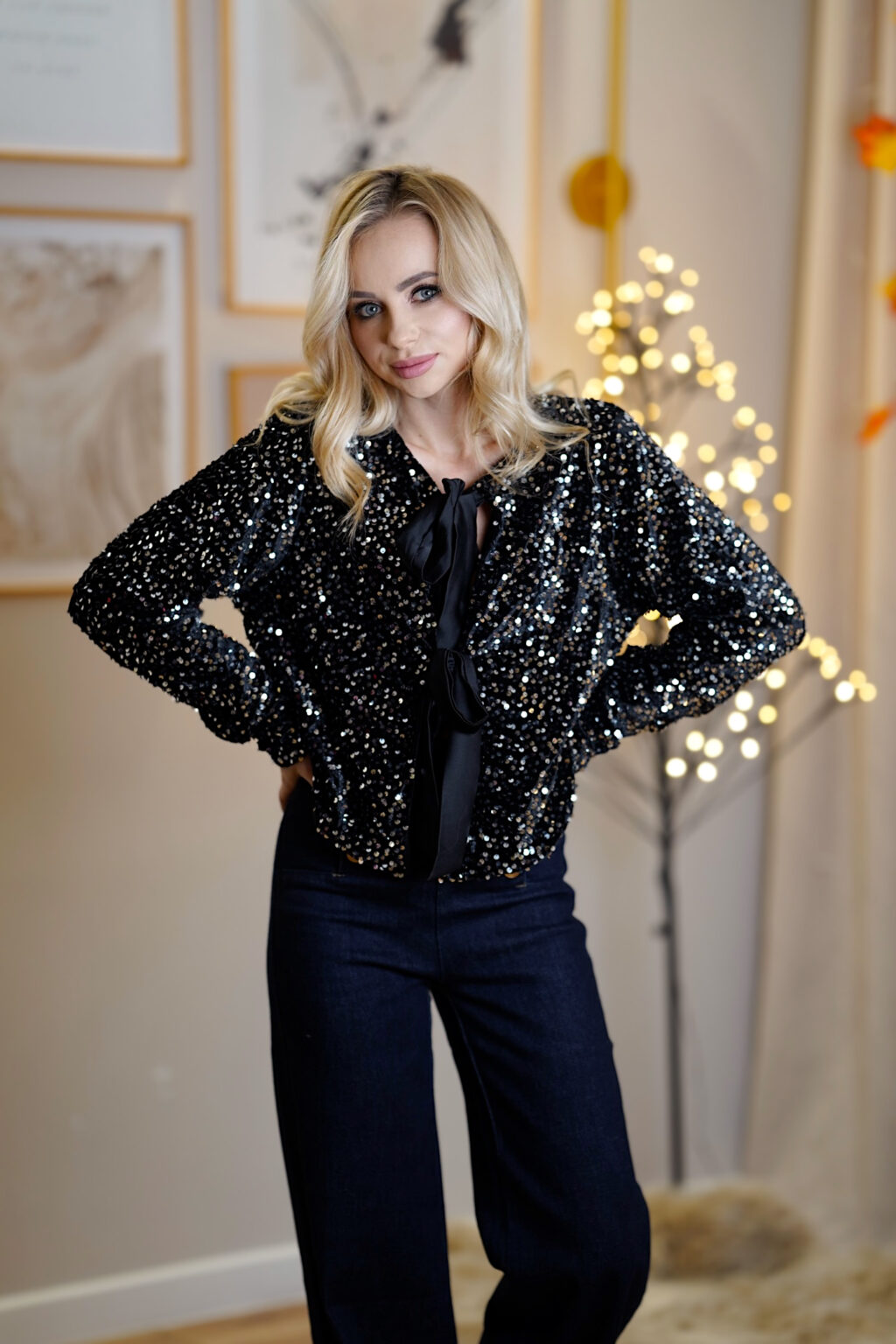 Cekinowy kardigan z wiązaniem SEQUIN BOW | czarno-srebrny