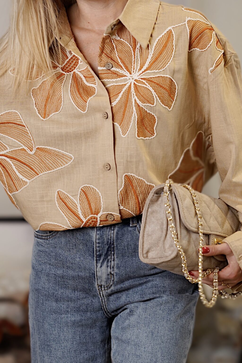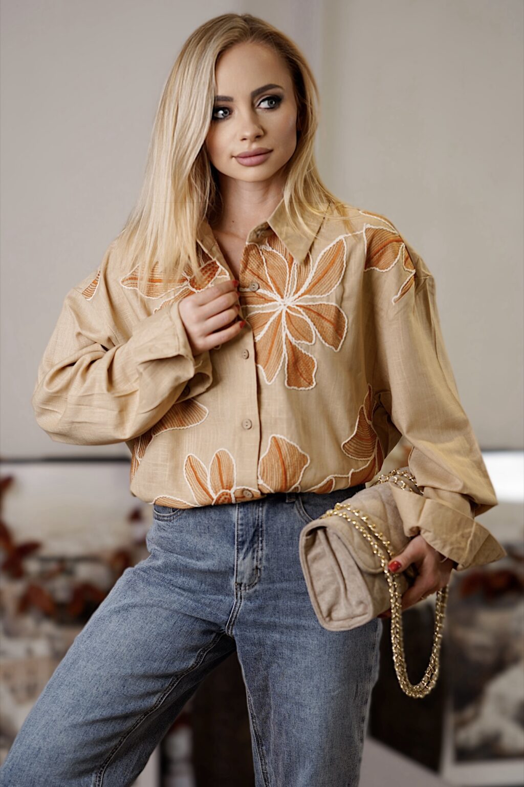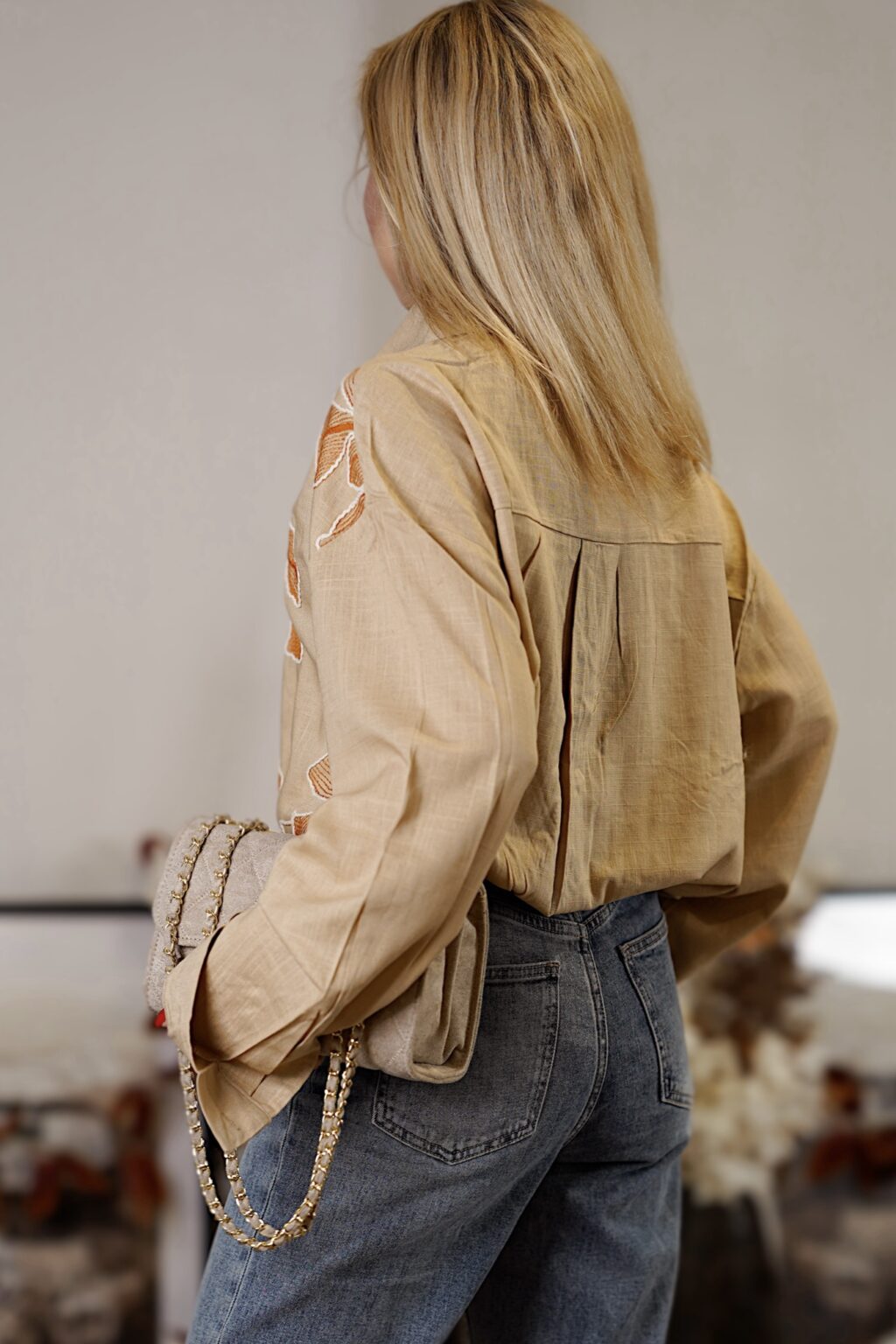 Luźniejsza koszula „Natural Muse” to połączenie wygody i artystycznego szyku. Oversize’owy krój w naturalnych odcieniach beżu i subtelny, kwiatowy haft tworzą duet, który przyciąga spojrzenia. Wykonana z przewiewnej mieszanki lnu i wiskozy – idealna zarówno do pracy, jak i na weekendowy wyjazd.
