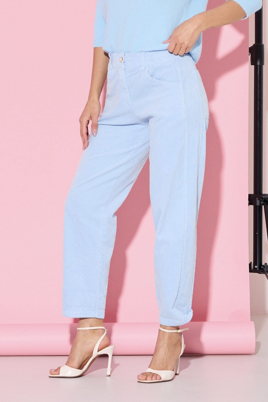 Spodnie NOEMI o prostym, lekko skróconym kroju, wykonane z miękkiego, drobno prążkowanego sztruksu, który jest przyjemny w dotyku i dobrze układa się na sylwetce; model z wysokim stanem podkreślającym talię, zapinany na ozdobny guzik, z praktycznymi kieszeniami z przodu, nogawki o luźniejszym fasonie zapewniają komfort noszenia i swobodę ruchów.