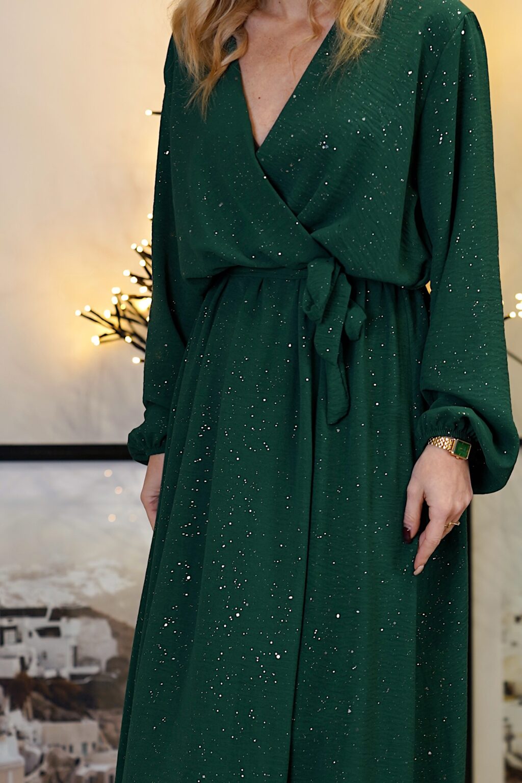 Bestsellerowy model Mally to sukienka, która wygląda jak świąteczny wieczór zamknięty w jednej stylizacji. Kobiecy krój z rozcięciem z przodu pięknie podkreśla nogi, a zielony, połyskujący materiał mieni się przy każdym ruchu niczym świąteczne światełka.
