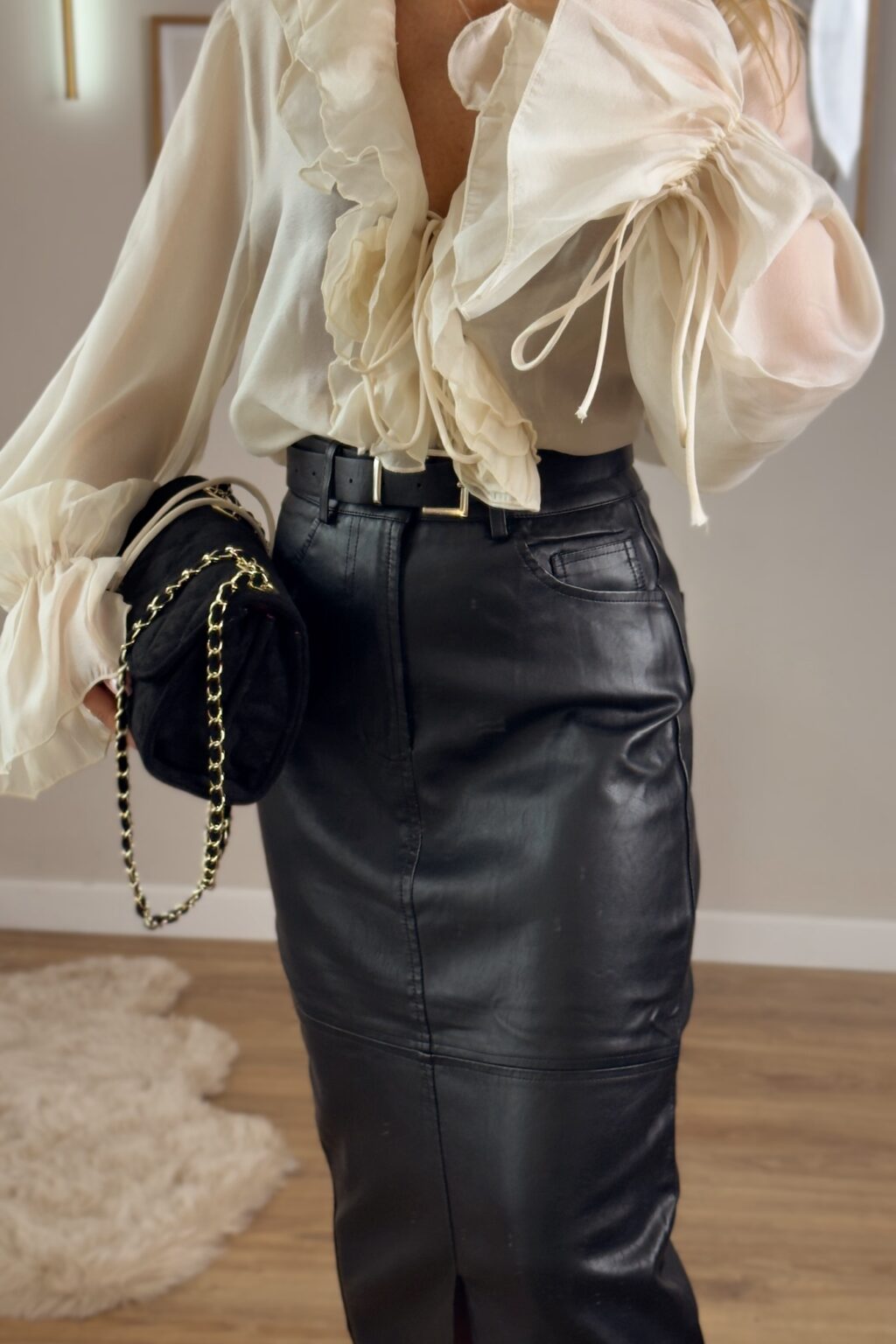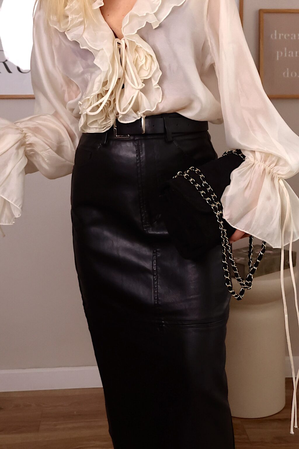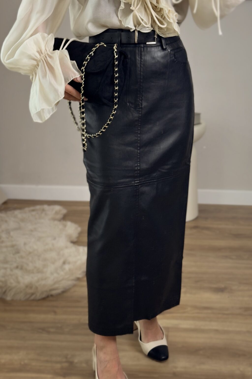 Klasyka i kobiecość w nowoczesnym wydaniu. Spódnica „Keep it” to model, który podkreśla sylwetkę i nadaje stylizacji wyrazistości. Wykonana z wysokiej jakości eko skóry, posiada pasek w talii, który pięknie ją podkreśla, oraz rozcięcie z przodu zapewniające komfort noszenia. Idealna zarówno do eleganckich koszul i botków, jak i do swetrów oversize i kozaków. Dostępna w rozmiarach XS–XL.