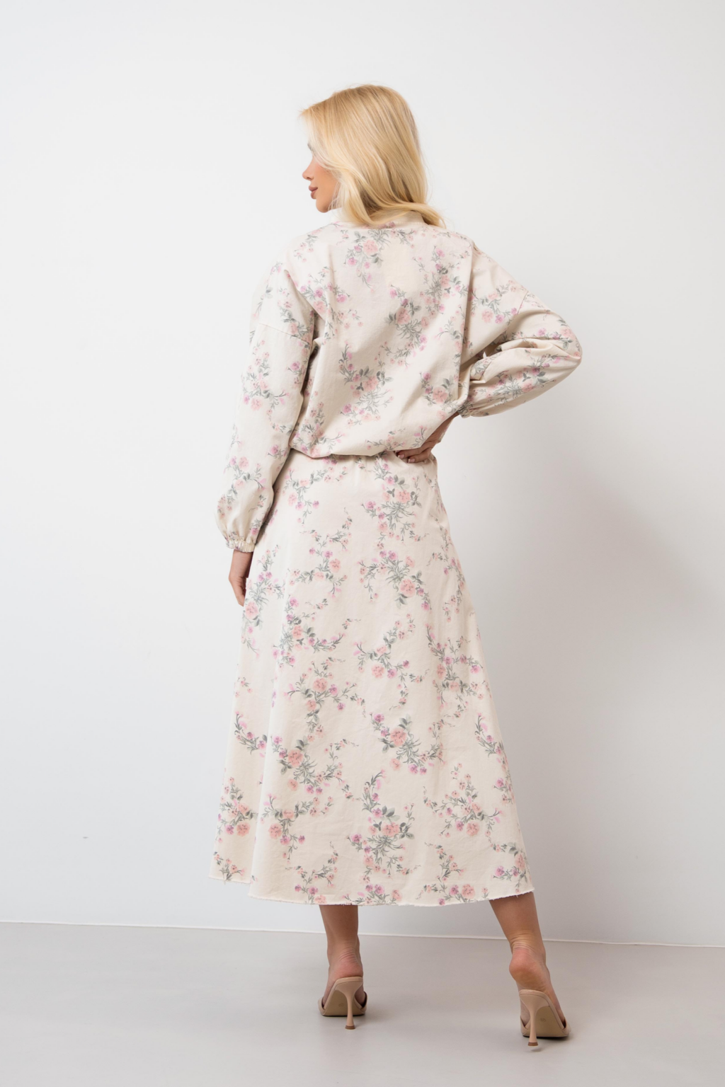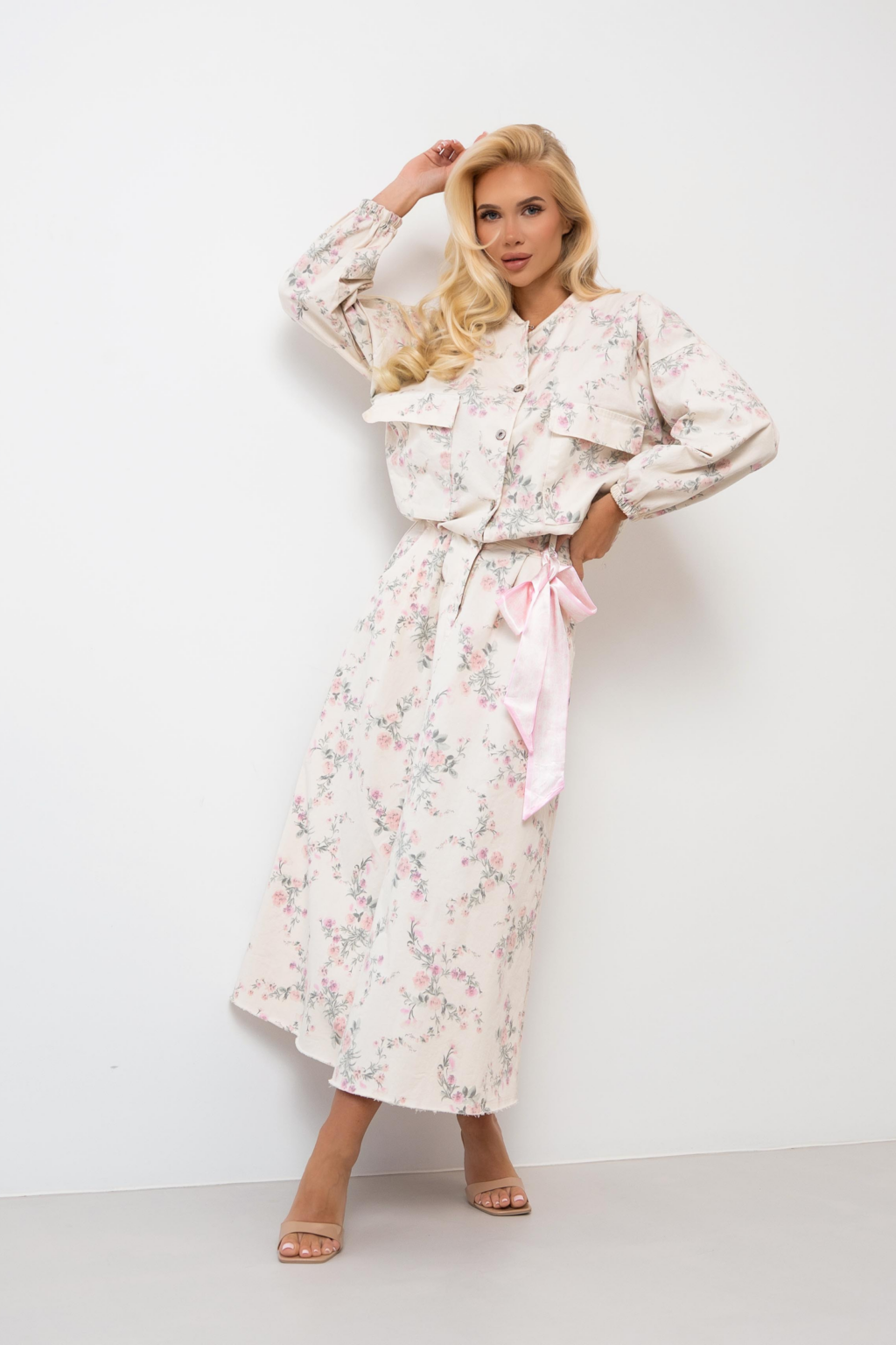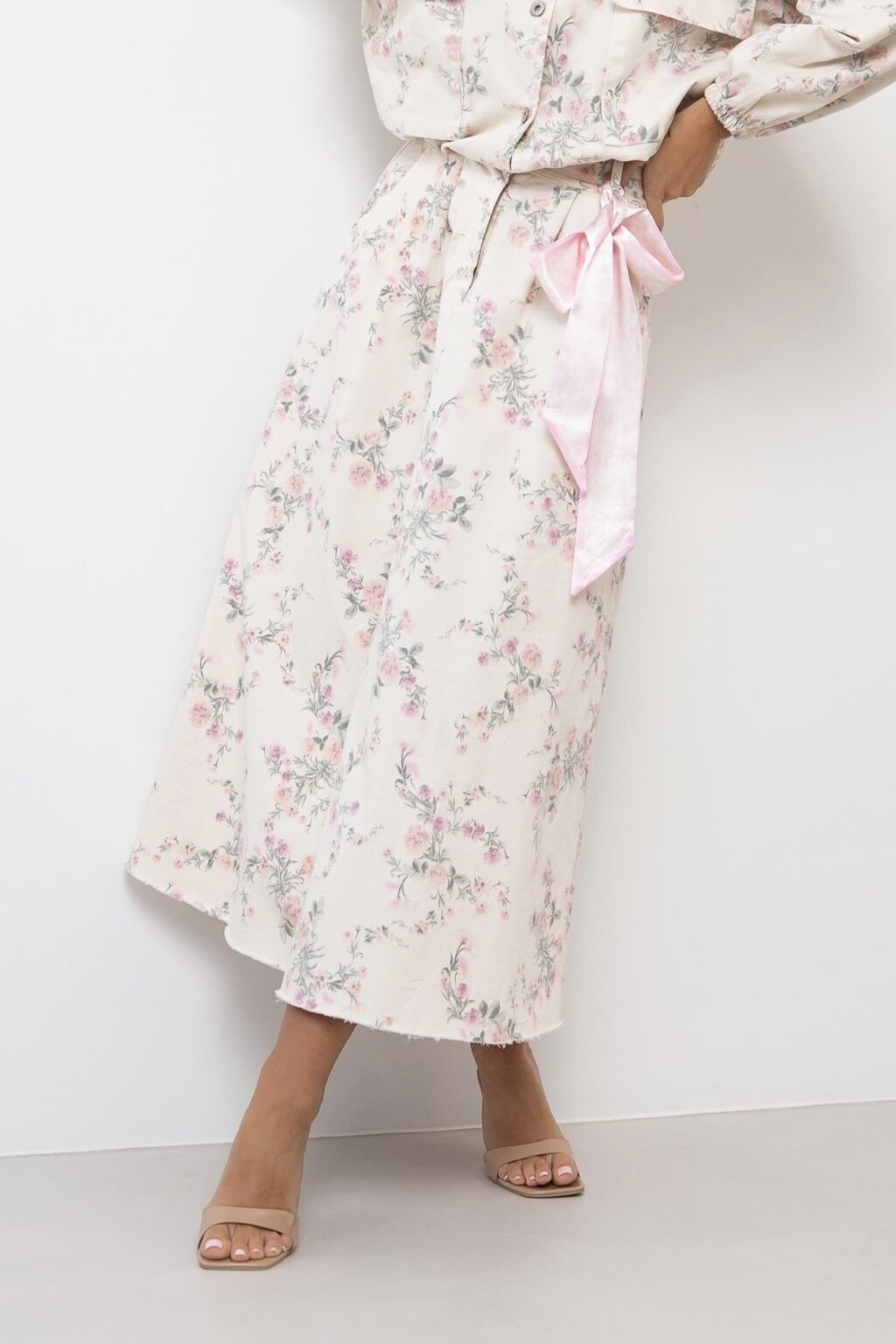Spódnica maxi to kwintesencja wiosennej świeżości i kobiecego wdzięku, ozdobiona subtelnym, kwiatowym printem w odcieniach różu i zieleni. Model charakteryzuje się klasycznym stanem z wyraźnie zaznaczoną linią talii oraz praktycznymi szlufkami, z których jedna została ozdobiona dekoracyjną, satynową wstążką w kolorze pudrowego różu. Rozkloszowany fason z delikatnymi plisami zapewnia swobodę ruchów, a surowe wykończenie dołu dodaje całości nowoczesnego, nieco casualowego charakteru.