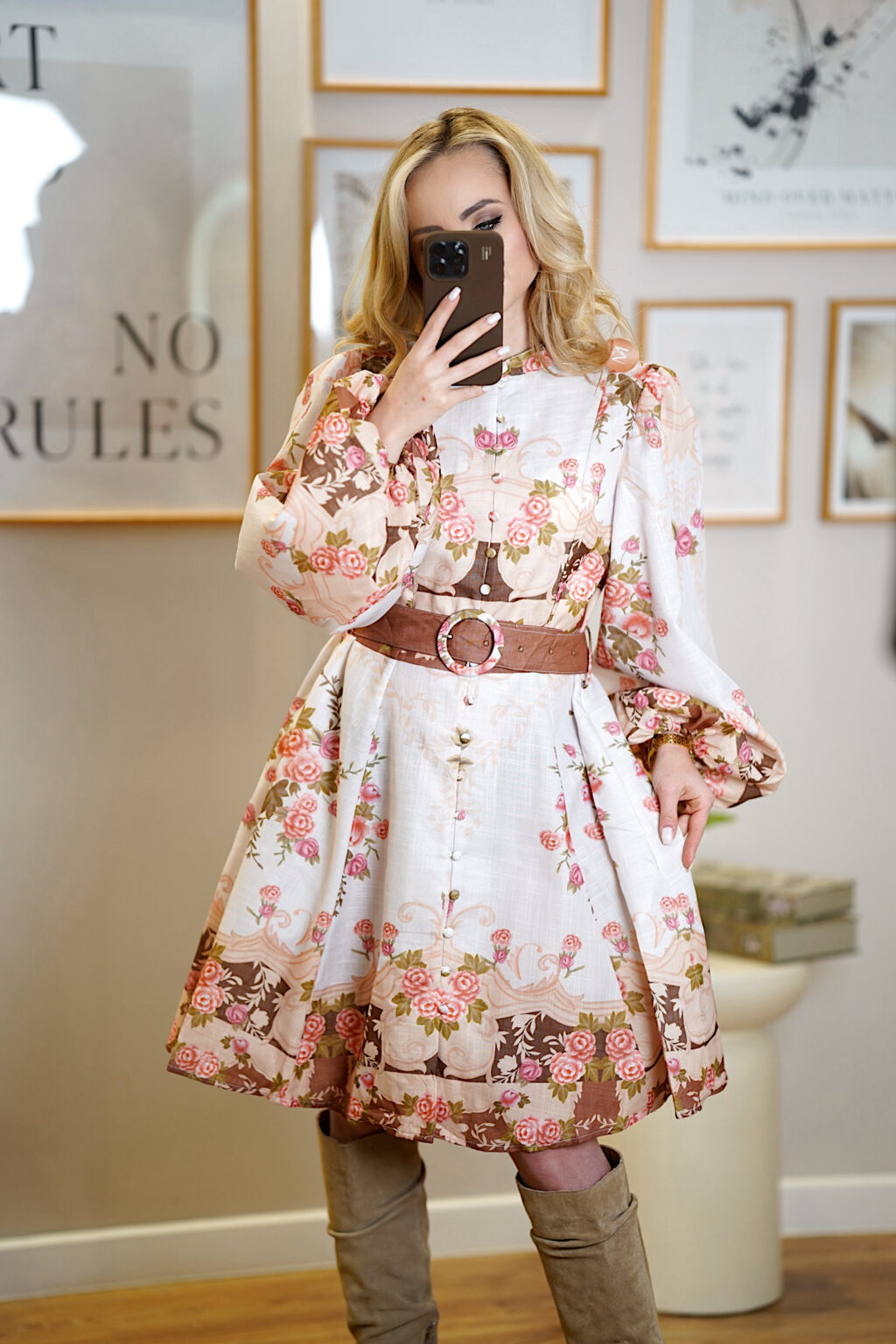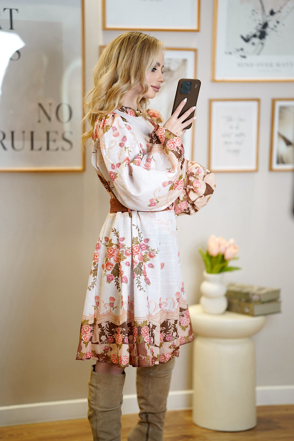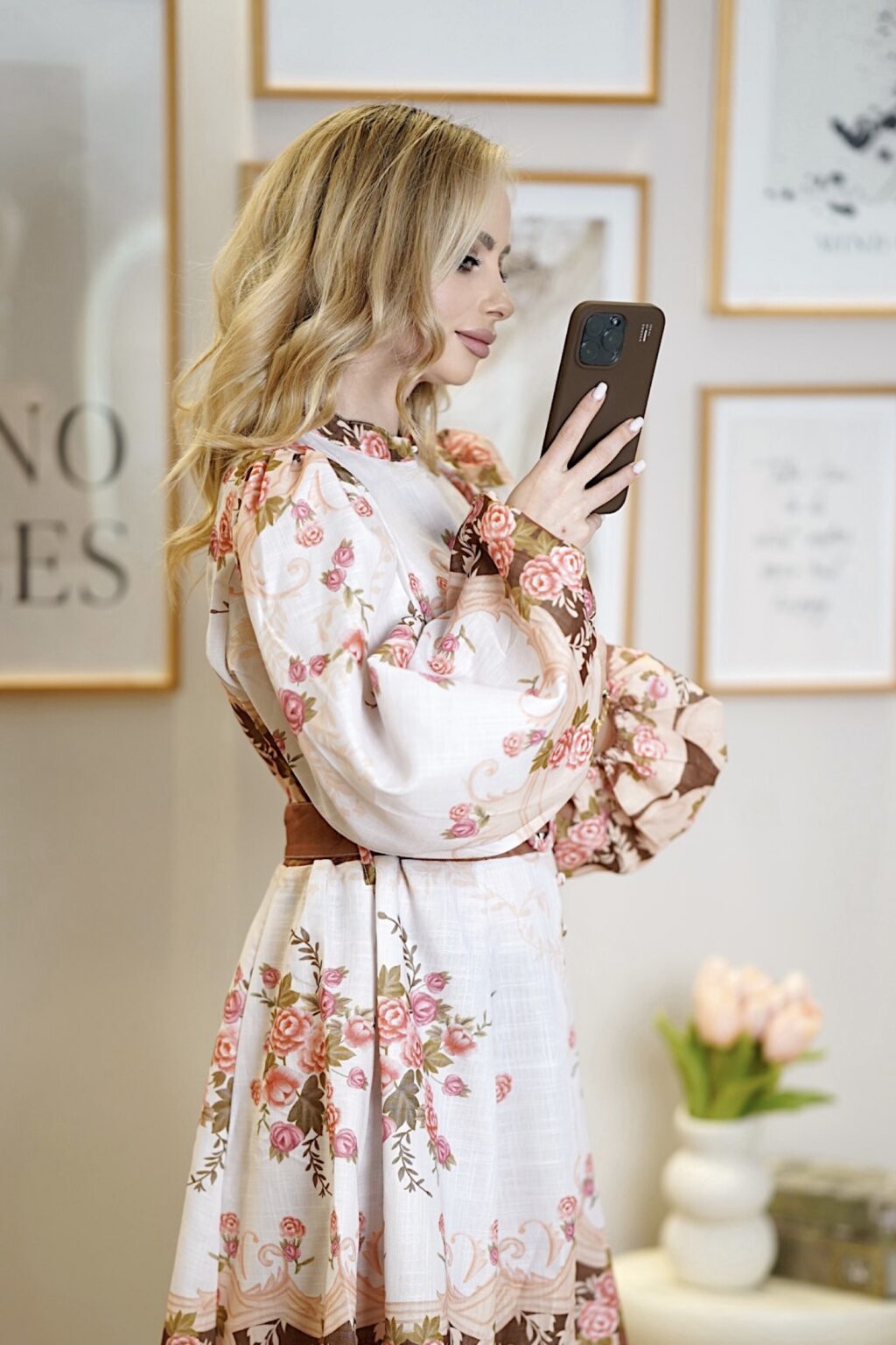 Biała sukienka w kwiatowy wzór utrzymana w romantycznym stylu boho. Delikatny floral print w odcieniach beżu i brązu tworzy subtelny, kobiecy efekt, a lekko rozkloszowany fason pięknie podkreśla sylwetkę. Model idealny na wiosnę i lato – zarówno na co dzień, jak i na wyjątkowe okazje.
