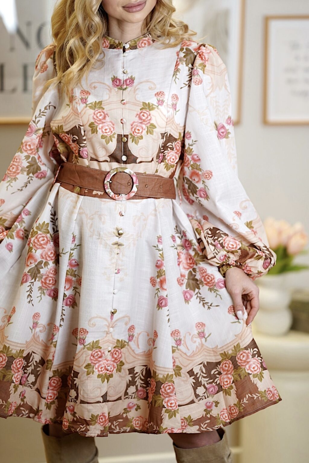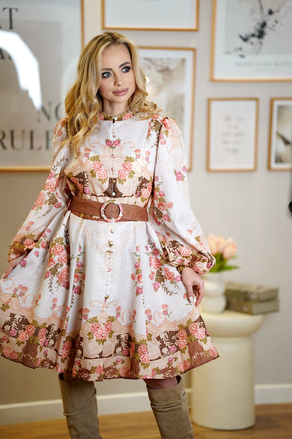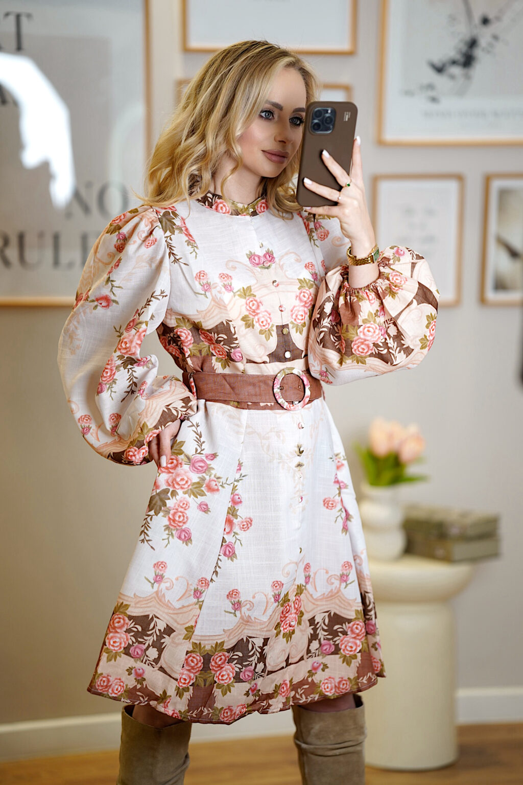 Biała sukienka w kwiatowy wzór utrzymana w romantycznym stylu boho. Delikatny floral print w odcieniach beżu i brązu tworzy subtelny, kobiecy efekt, a lekko rozkloszowany fason pięknie podkreśla sylwetkę. Model idealny na wiosnę i lato – zarówno na co dzień, jak i na wyjątkowe okazje.